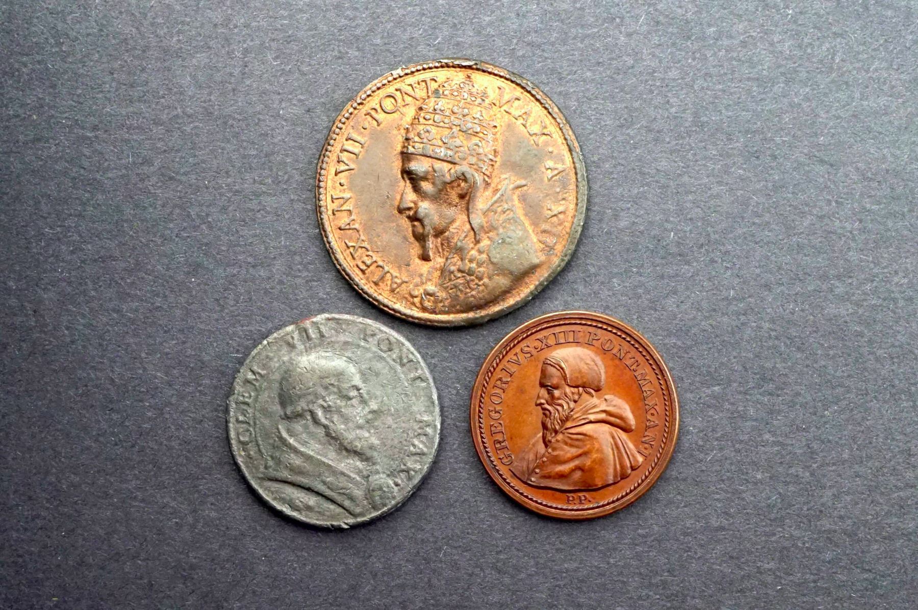 3 Pcs. Alexander VII 2nd generation cast Hospital Renovations VF AE-41, Clement VII by Cellini F/VF, Lead-32, 20.7 grs & Gregory XIII Slaughter of the Huguenots Mazio-110, EF, AE-31, 12.8 grs.