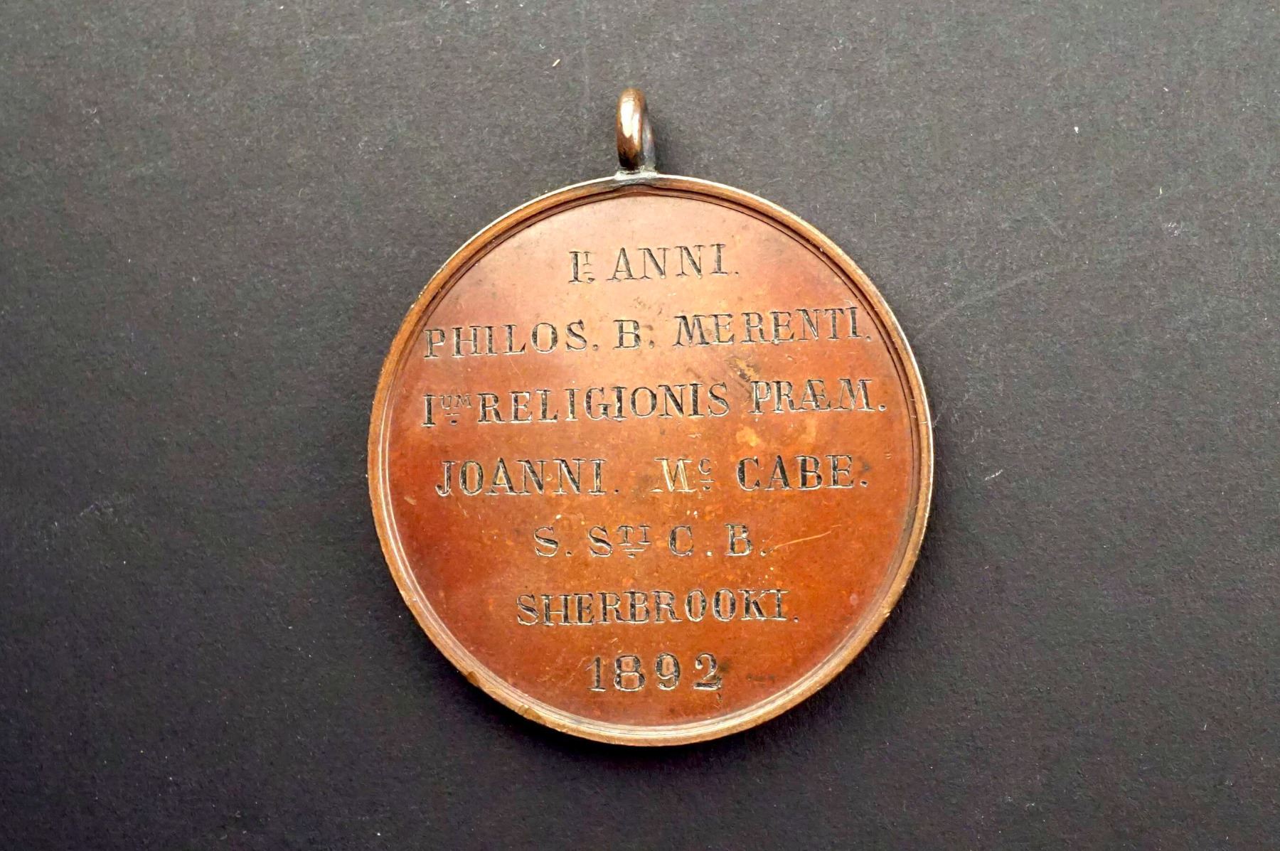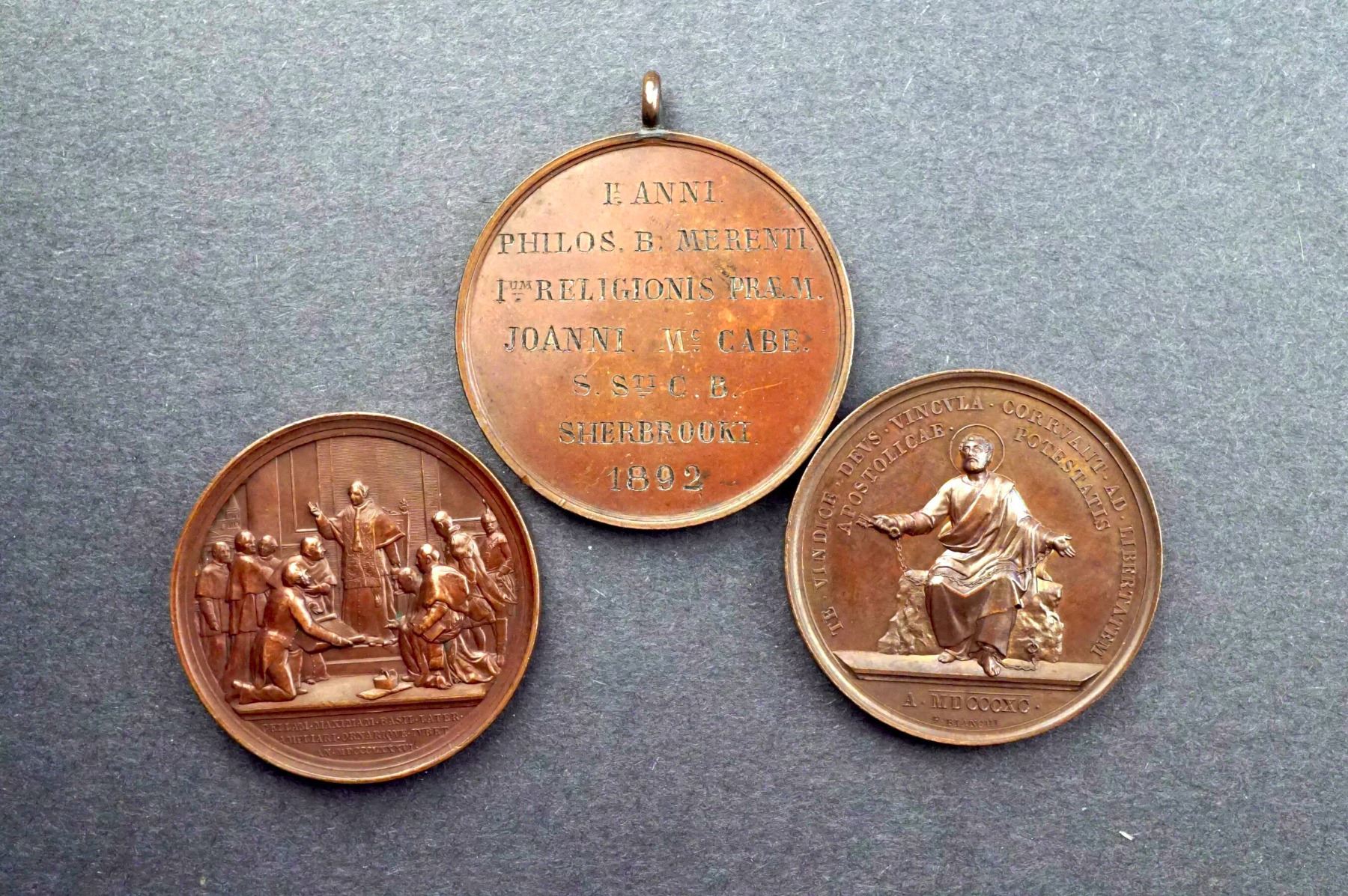3 Pcs. Leo XIII Annuals year 9 & 13 FDC AE-44 Bronzes & AE-47 looped w/smaller bust named to J.McCabe as an award dated 1892 issued in Sherbrooke, QC. UNIQUE