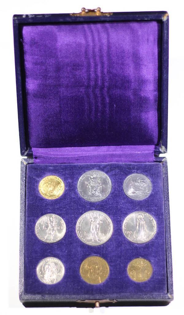 Vatican, 1939, 9-piece mint set with original box. Includes G100L Gold coin. Lovely choice set.