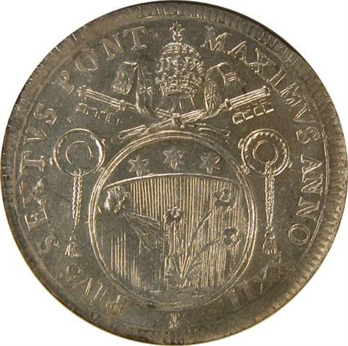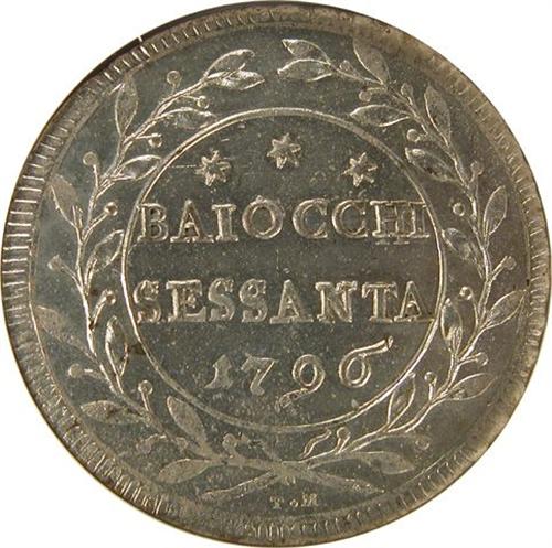 60 Baiocchi 1796 NGC MS-64. A strongly struck piece with great lustre and pale golden toning