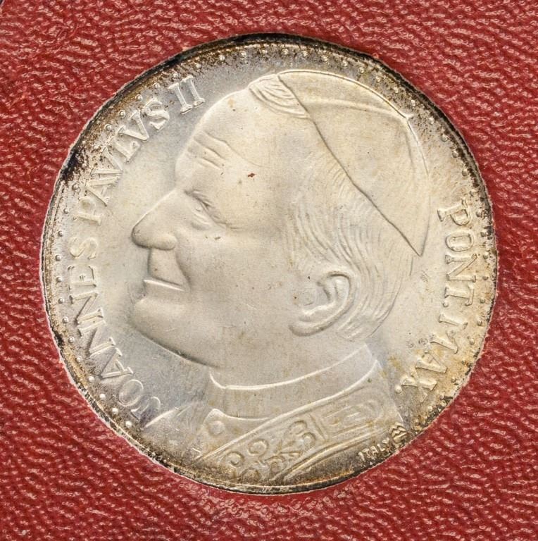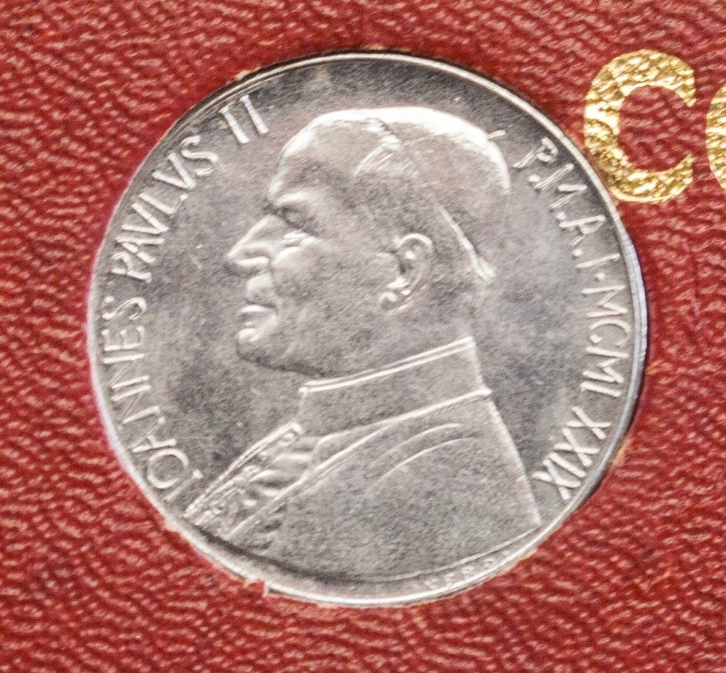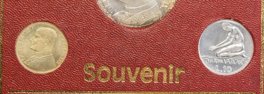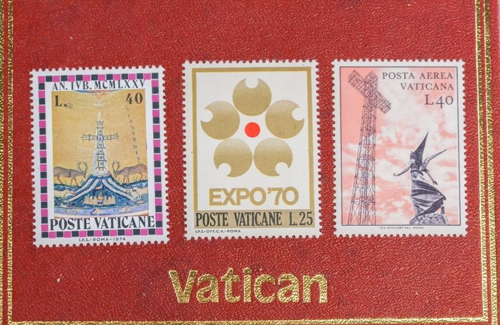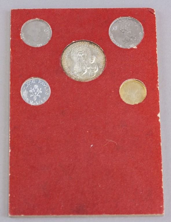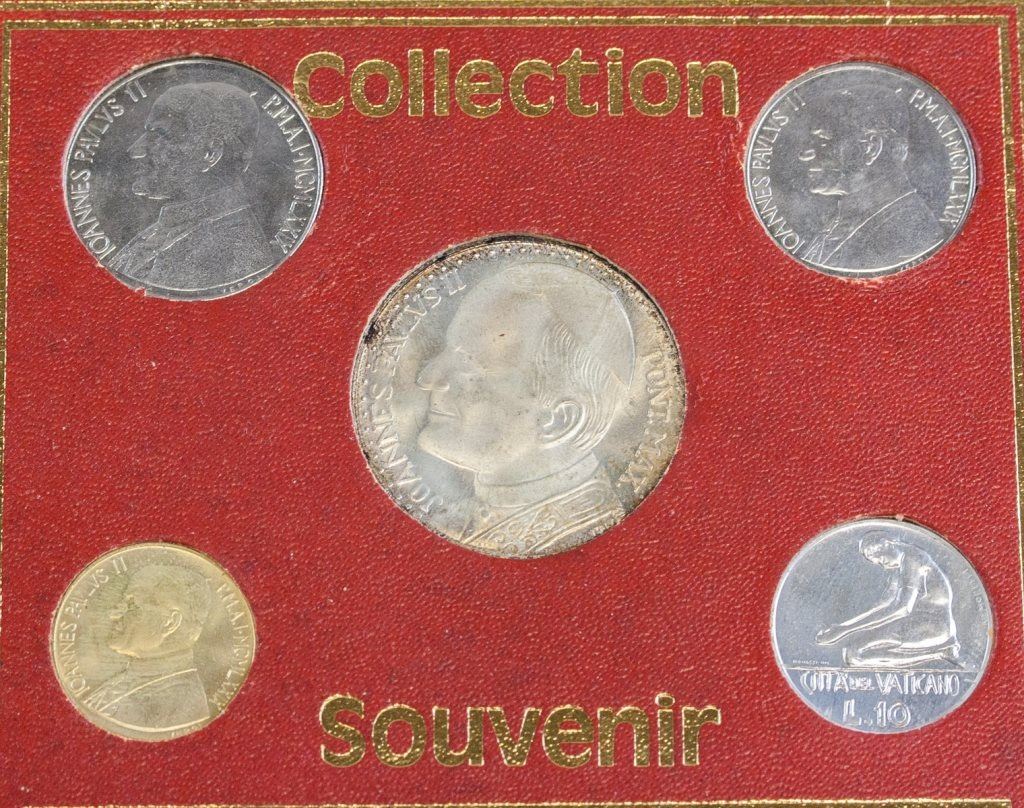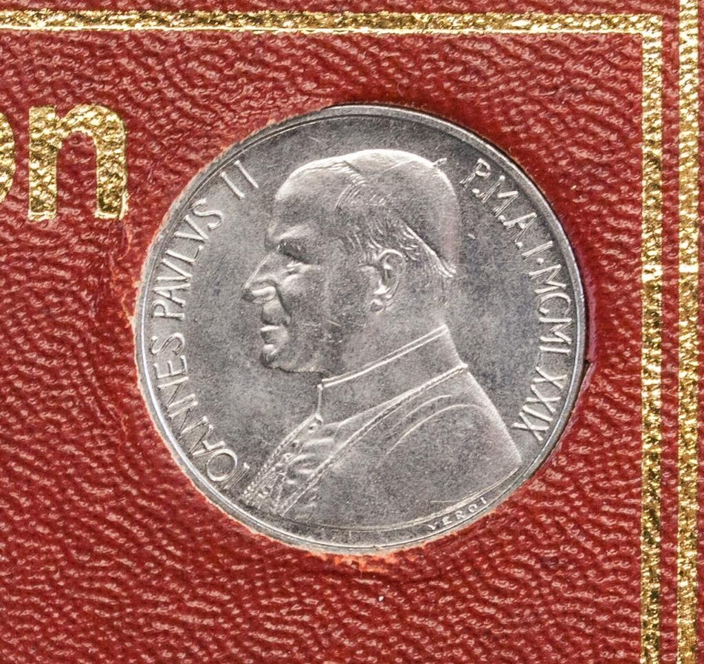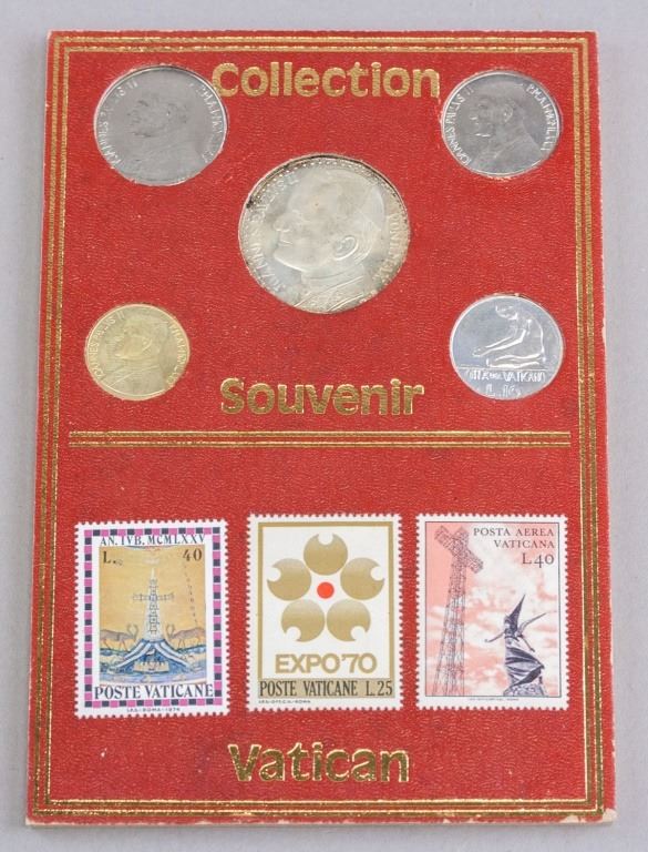 Vatican coin and stamp set. Featuring five coins of different denominations and three stamps. 18 x 12 cm. 88 grams.