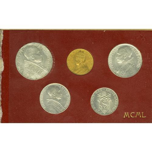<B>Vatican. Pius XII 5-piece mint sat with gold 1950,</B></I>KM-MS44, 1, 2, 5, 10, and 100 Lire, housed in original mint folder, all are UNC, the 10 Lire with minor spotting on the obverse.