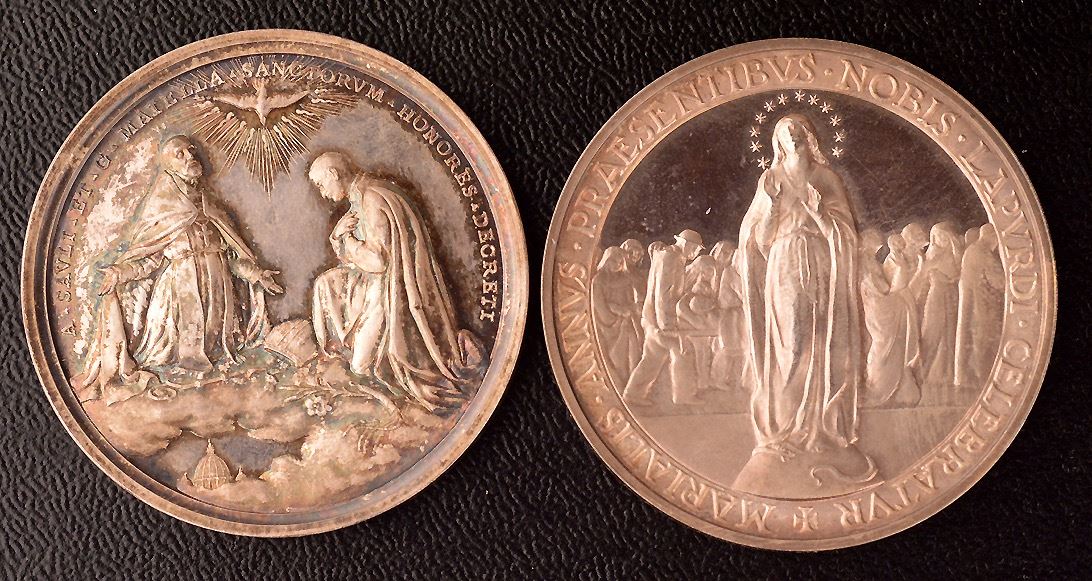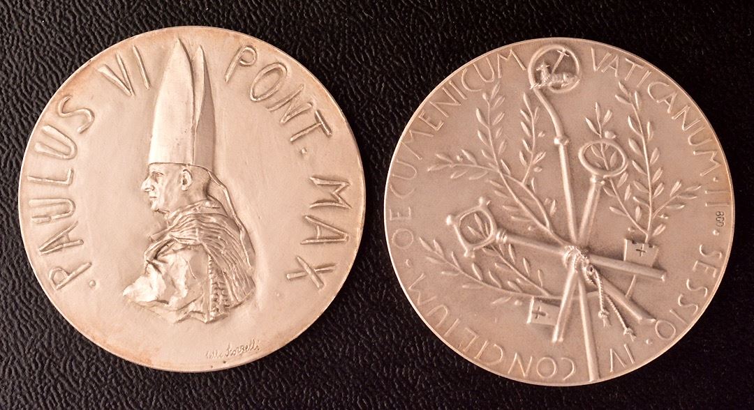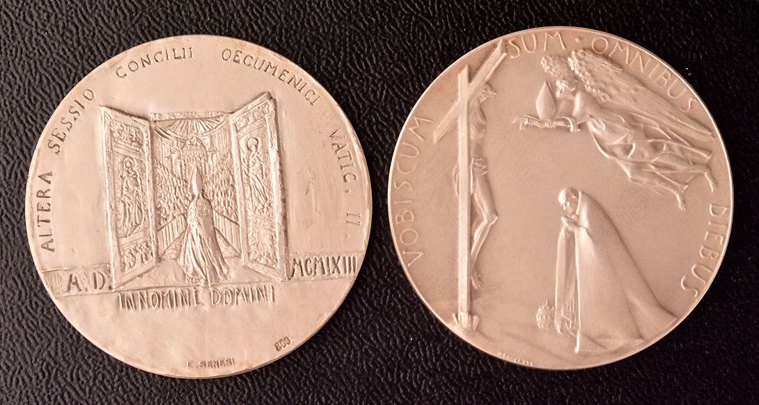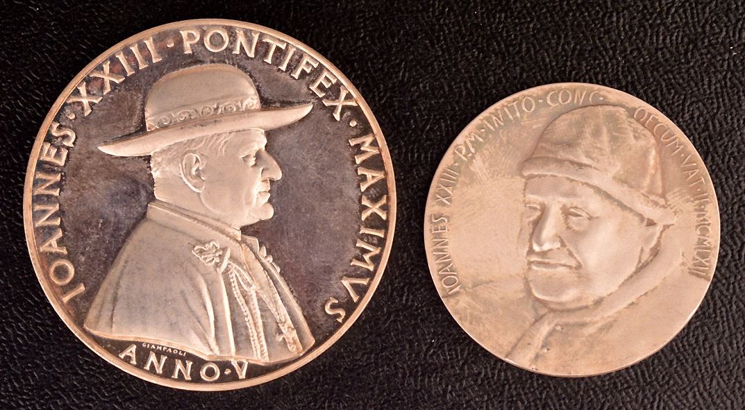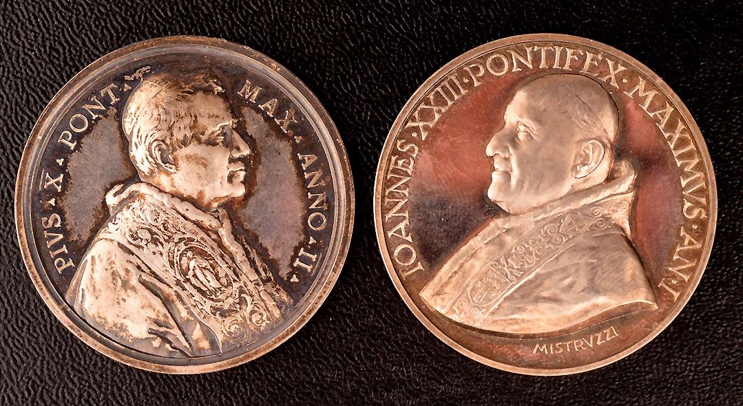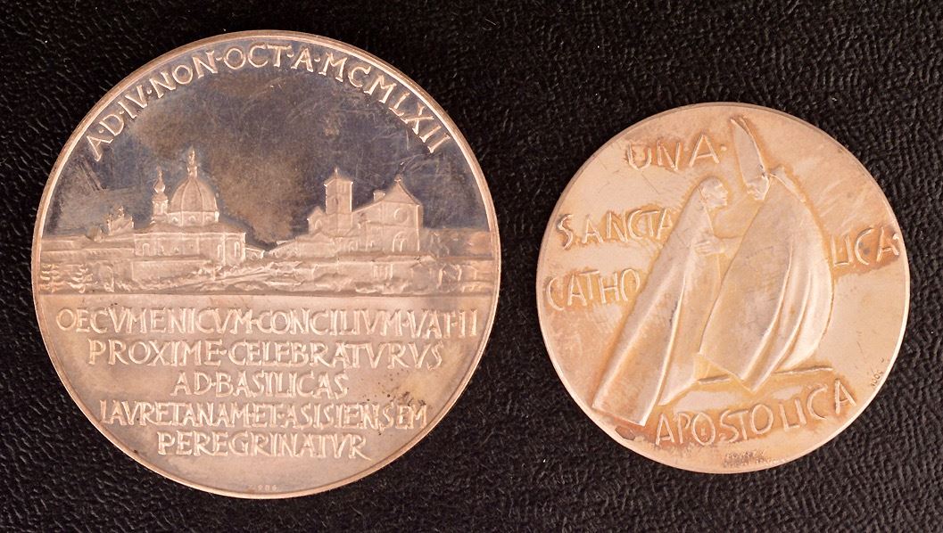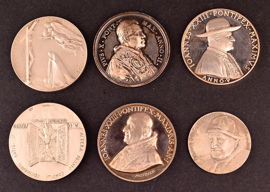 Vatican Silver medal group, (1)- Pius X, Anno II, (1904), M-13, 43.5 mm, 34 gms, Unc. Two saints in the clouds ; (2)- John XXIII, Anno I, (1958), M-06, 44 mm, 40 gms, Unc., a few light wispy hairlines. The Madonna of Lourdes (Not Lourdes of Madonna); (3)- Anno V, (1962), M-10, 44 mm, 40 gms, Unc. The Basilica of Loreto and Assisi; (4)- Another, 1962, bust 3/4 facing left, Rev: two popes facing, "Una Sancta Catholica Apostolica"; Ar, marked 1000, 35mm, 15 gms, EF, a few scratches; (5)- Obv: Pope kneeling before Christ, angel above, "Vobiscum Sum Omnibus Diebus"; Rev: Olive branches and crossed papal keys, "Concilium Oecumenicum Vaticanum II Sessio IV"; Ar, marked 800, 44mm, 44.5 gms, FDC; (6)- Paul VI, Obv: pope facing left, "Paulus VI Pont. Max"; Rev: Pope facing ecumenical council, at centre, "Altera Sessio Concili Oecumenici Vatic. II", "Innomine Domini" in exergue, "A.D. MCMLXIII" on banner at lower centre; Ar, marked 800, 44 mm, 37 gms, good EF; total of 6 medals, 210 gms total weight. Couple are scarce.