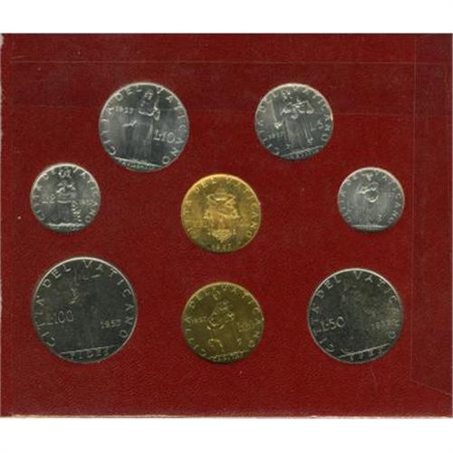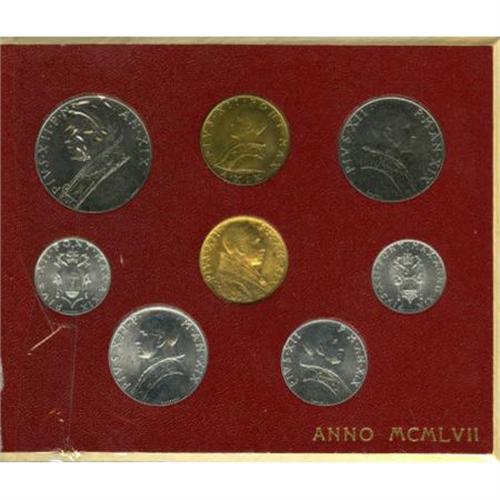 <B>Pius XII Mint Set 1957,</B></I> KM-MS56, the eight coin set including the gold 100 Lire, in the original card of issue.<BR><BR><b>Shipping:</b> Coins & Currency (<a target="_blank" href="http://www.heritageauctions.com/common/shipping.php">view shipping information</a>)