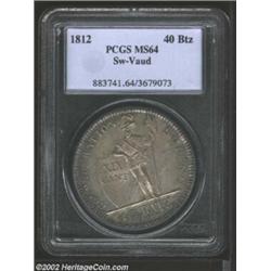 Vaud. 40 Batzen 1812, Arms with date below/Knight leaning on shield with value below, Dav-362, KM-17, MS64 PCGS. Sharply struck and lustrous with light russet toning. Very scarce with a small mintage of 2,485 pieces of which 616 pieces were melted in 1851. Important notice: We expect to be auctioning lots at the rate of 200-250 per hour. Sometimes eBay Premier live bid software cannot keep up with that pace, so we strongly recommend that you place a realistic proxy bid now as insurance to avoid disappointment. Also please note that all Heritage/CAA lots purchased through eBay Premier carry a 20% Buyer's Premium. Please make sure you read the Terms and Conditions.