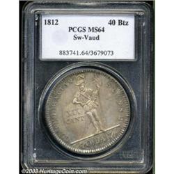 <TABLE cellSpacing=0 cellPadding=0 width="100%" bgColor=#000000 border=0><TBODY> <TR><TD width="100%"><TABLE cellSpacing=1 cellPadding=3 width="100%" border=0><TBODY><TR><TD width="100%" bgColor=#79735c><FONT face=arial color=#ffffff size=3><B>Description</B> </FONT></TD></TR><TR><TD width="100%" bgColor=#ffffff><FONT face=arial size=2><B>Vaud. 40 Batzen 1812,</B></I> Arms with date below/Knight leaning on shield with value below, Dav-362, KM-17, MS64 PCGS. Sharply struck and lustrous with light russet toning. Very scarce with a small mintage of 2,485 pieces of which 616 pieces were melted in 1851. </FONT></TD></TR></TBODY></TABLE></TD></TR></TBODY></TABLE><BR><A name=PricesRealized></A><TABLE cellSpacing=0 cellPadding=0 width="100%" bgColor=#000000 border=0><TBODY><TR><TD width="100%"><TABLE cellSpacing=1 cellPadding=3 width="100%" border=0><TBODY><TR><TD width="100%" bgColor=#79735c><A name=PR><FONT face=arial color=#ffffff size=3><B>Previous Prices from Heritage Auctions</B> </FONT></A></TD></TR><TR><TD bgColor=#f6f6ed>No Prior Data Recorded </TD></TR><TR><TD bgColor=#ffffff><FONT face=arial size=1 ?>PLEASE NOTE: All prices realized reflect the final hammer price PLUS the buyer's premium in auctions that charge a buyer's premium. Each item has a notation at the top of the listing indicating whether that lot included a buyer's premium. Example: A item that sells with a final hammer price of $100 and a 20% buyer's premium will display with a price realized of $120. All information listed is intended to be as accurate as possible, but errors are possible. Please use this guide carefully and inform us of any inaccuracies. </FONT></TD></TR></TBODY></TABLE></TD></TR></TBODY></TABLE><BR><TABLE cellSpacing=0 cellPadding=0 width="100%" bgColor=#000000 border=0><TBODY><TR><TD width="100%"><TABLE cellSpacing=1 cellPadding=3 width="100%" border=0><TBODY><TR><TD width="100%" bgColor=#79735c colSpan=6><FONT face=arial color=#ffffff size=3><B>Price Guide*</B> </FONT></TD></TR><TR bgColor=#f6f6ed><TD align=middle><B>Grade</B> </TD><TD align=middle><B>Coin World<BR>(Trends)</B> </TD><TD align=middle><B>Numismedia<BR>Retail</B> </TD><TD align=middle><B>Numismedia<BR>Wholesale</B> </TD><TD align=middle><B>Coin<BR>Universe</B> </TD><TD align=middle><B>Heritage<BR>Value Index</B> </TD></TR><TR bgColor=#ffffff><TD align=middle>0</TD><TD align=right>---</TD><TD align=right>---</TD><TD align=right>---</TD><TD align=right>---</TD><TD align=right>---</TD></TR><TR style="FONT-WEIGHT: bold" bgColor=#cccfdd><TD align=middle>1</TD><TD align=right>---</TD><TD align=right>---</TD><TD align=right>---</TD><TD align=right>---</TD><TD align=right>---</TD></TR><TR bgColor=#ffffff><TD colSpan=6><FONT size=1>*All information listed is intended to be as accurate as possible, but errors are possible. No item may be returned or refused based on this information which is provided as a service to our customers. You should contact each pricing source directly to determine the accuracy of this information. </FONT></TD></TR></TBODY></TABLE></TD></TR></TBODY></TABLE><BR><TABLE cellSpacing=0 cellPadding=0 width="100%" bgColor=#000000 border=0><TBODY><TR><TD width="100%"><TABLE cellSpacing=1 cellPadding=3 width="100%" border=0><TBODY><TR><TD width="100%" bgColor=#79735c><FONT face=arial color=#ffffff size=3><B>Population Guide</B> </FONT></TD></TR><TR bgColor=#ffffff><TD align=middle><!-- Begin Output of Population Grid--><TABLE cellSpacing=0 cellPadding=0 width="100%" border=0><TBODY><TR><TD vAlign=center><TABLE cellSpacing=0 width="100%" border=1 cellsadding="3"><TBODY><TR><TD vAlign=center><TABLE cellSpacing=0 cellPadding=3 width="100%" border=1><TBODY><TR><TD vAlign=center align=middle bgColor=#f0f1e8 colSpan=2 <CENTER><FONT face=Arial size=2><B>PCGS Pop </B></FONT><CENTER></CENTER></TD><TD vAlign=center align=middle bgColor=#f0f1e8 colSpan=2><CENTER><FONT face=Arial size=2><B>NGC Pop</B></CENTER></FONT></TD></TR><TR><TD vAlign=center><FONT face=Arial size=2>(0)</FONT> </TD><TD vAlign=center align=right><FONT face=Arial size=2>1</FONT> </TD><TD vAlign=center><FONT face=Arial size=2>(0)</FONT> </TD><TD vAlign=center align=right><FONT face=Arial size=2>0</FONT> </TD></TR><TR><TD vAlign=center><FONT face=Arial size=2>(>0)</FONT> </TD><TD vAlign=center align=right><FONT face=Arial size=2>2</FONT> </TD><TD vAlign=center><FONT face=Arial size=2>(>0)</FONT> </TD><TD vAlign=center align=right><FONT face=Arial size=2>0</FONT> </TD></TR></TBODY></TABLE></TD></TR></TBODY></TABLE></TD></TR></TBODY></TABLE><!-- End Output of Po Important notice: Heritage usually auctions material at the rate of 200-250 lots per hour. On some occasions eBay Live bid software or the Internet may not be able to keep up with the pace of the auction. We recommend placing a realistic absentee bid now as insurance to avoid disappointment. Occasionally the auctioneer may eliminate or reject an eBay Live bid, and the auctioneer may also reopen a lot after the close of the eBay live bidding (usually because we missed an audience bid), and may reject your bid even if it shows you as the winning bidder. By bidding via eBay Live, you agree that Heritage may award the lot to another bidder at its sole discretion under the circumstances described above or any other reasonable circumstances. Also please note that all Heritage lots purchased through eBay Live carry a 20% Buyer's Premium. Please make sure you read the Terms and Conditions before you bid.</TD></TR></TBODY></TABLE></TD></TR></TBODY></TABLE>