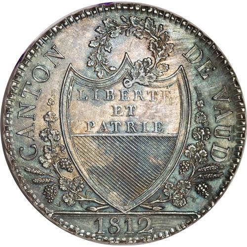 <B>Vaud. 40-Batzen (Thaler) 1812,</B></I> KM-17, another low-mintage piece (2485 in all), Choice AU-UNC, a particularly beautiful coin having deep bluish mauve toning, excellent surfaces, and huge rims almost all around both sides. Fairly rare grade. Go to Switzerland and see how many you can locate this fine. Avoid disappointment and bid on this one from the comfort of home or in our auction gallery.<BR><BR><b>Shipping:</b> Coin/Currency (<a target="_blank" href="http://www.heritageauctions.com/common/shipping.php">view shipping information</a>)