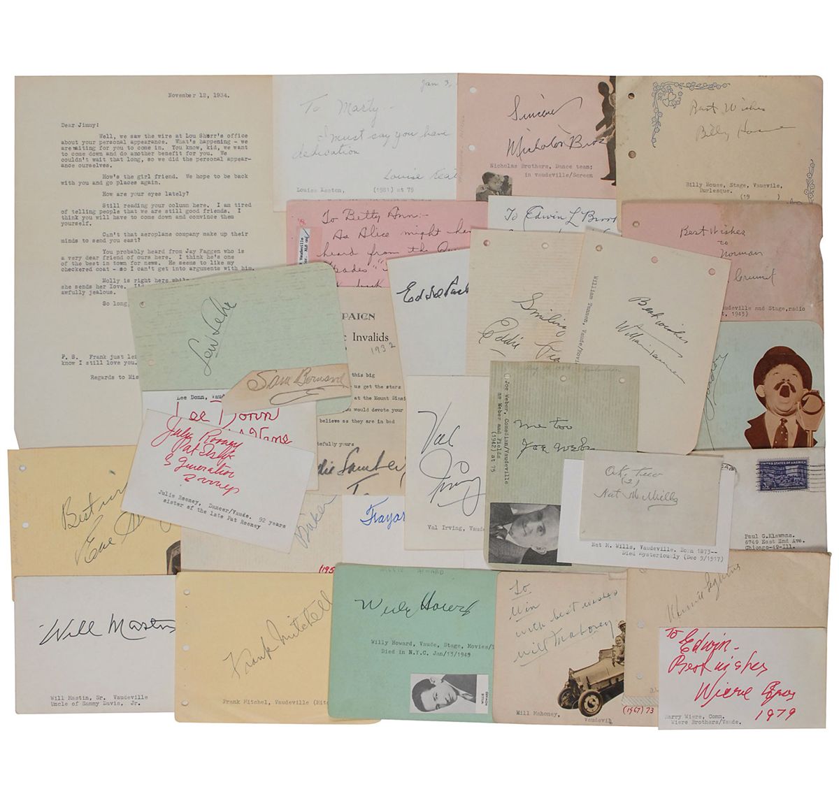 Collection of 32 signatures of vaudeville celebrities, mostly on album pages, clipped slips, and cards, a few inscribed, including many vintage, as well as a couple of signed envelopes and sheets. Signers are: Eddie Parkes, Nat M. Wills, Belle Baker, Eve Sully, Al Shean, Jesse Block, Eddie Peabody, Lew Lehr, Fayard Nicholas (2), one of the Nicholas Brothers, Louise Keaton, Eddie Sanchez (letter), Winnie Lightner, Pat Rooney, Bert Gordon, Joe Weber, Jack Durant (letter), Val Irving, Frank Crumit, Billy House, Will Mahoney, Sam Bernard, Willie Howard, William Tannen, Frank Mitchell, Lee Donn, Harry Wiere, Will Mastin, Julia Rooney, Joe Smith, Harland Dixon, and Will Ahern. In overall very good condition.