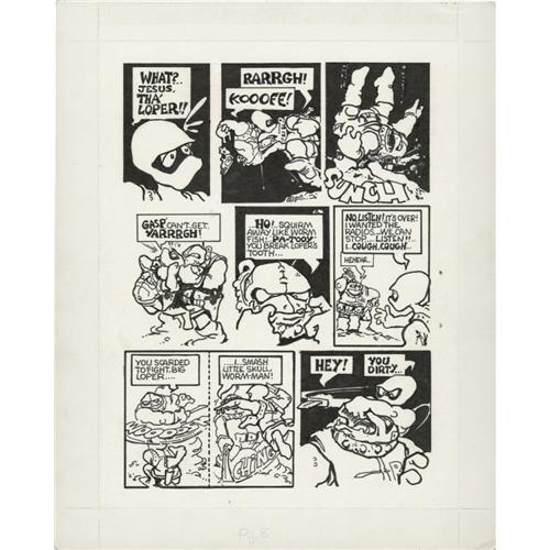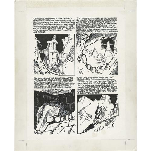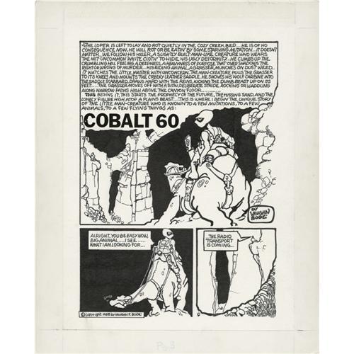 <B>Vaughn Bode - Cobalt 60 Panel Page Original Art, Group of 3 (1968).</B></I> Vaughn Bode's Cobalt 60 takes place in a post-apocalyptic, Mad Max-like world inhabited by mutants, aliens and other fantastic creatures. Its grim, masked hero, Cobalt 60, embarks on a quest to avenge the death of his parents, murdered by the evil Strontium-90. These three pages (page 1, title page 3, and page 8) are from Bode's very first Cobalt 60 story, created before his better-known <B>Cheech Wizard</B></I> comics. This story eventually saw print in Bill Pearson's <B>witzend</B></I> #7, in 1970; years later, the saga was continued by Vaughn's son Mark. These pages were drawn in ink on 8.5" x 11" paper, which was later attached to illustration board measuring 10.5" x 13". All three pages are in Excellent condition. Finding any of these early pages is a miracle in itself; here's a chance to pick up three incredible pages from a legendary artist who left this mortal coil far too soon.