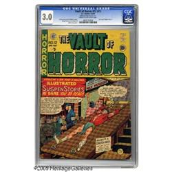 <B>Vault of Horror #12 (EC, 1950) CGC GD/VG 3.0 Cream to off-white pages.</B></I> First issue with of this title, and tied with <B>Crypt of Terror</B></I> #17 as the first horror comic. Overstreet designates this issue as "scarce." And with the Johnny Craig cover, and interior art by Craig, Al Feldstein, and Harvey Kurtzman, it's classic EC. CGC notes, "Small piece of tape on interior cover." Overstreet 2004 GD 2.0 value = $450; VG 4.0 value = $900. CGC census 1/05: 1 in 3.0; 15 higher.