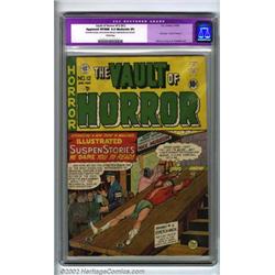 Vault of Horror #12 Ex. Bill Gaines (EC, 1950). This book is generally considered, along with Crypt of Terror, to be the first horror comic. This is the first Vault of Horror issue, and features Johnny Craig and Al Feldstein artwork and a "killer" bondage horror cover. Purchased by Bill Gaines in the aftermarket, this book comes directly from Annie Gaines, the widow of Bill Gaines, the late EC publisher. CGC notes, "Color touch, tear seals, piece added, reinforcement, and cleaning." CGC Apparent VF/NM 9.0 Moderate (P). Overstreet 2001 NM 9.4 value = $4,600.  Important notice: We expect to be auctioning lots at the rate of 200-250 per hour. Sometimes eBay Premier live bid software cannot keep up with that pace, so we strongly recommend that you place a realistic proxy bid now as insurance to avoid disappointment. Also please note that all Heritage/CAA lots purchased through eBay Premier carry a 20% Buyer's Premium.