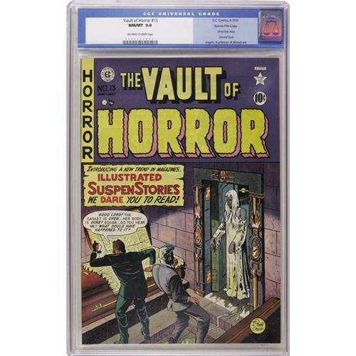 <B>Vault of Horror #13 Gaines File pedigree 3/9 (EC, 1950) CGC NM/MT 9.8 Off-white to white pages.</B></I> Remember those comics that terrified you as a kid? This was one of them. Despite the issue number, this is the true second issue of this title (it was <B>War Against Crime</B></I> for the first 11 issues). It's also memorable for the infamous morphine story contained within its pages. Additionally, this is one of the scarcest Gaines File pedigree books, as there were only nine copies of this issue in the collection, instead of the usual twelve. This copy ties with one other as the highest graded in the CGC census. Virtually perfect, this book is a pleasure to look at. Overstreet 2006 NM- 9.2 value = $1,500. CGC census 10/06: 2 in 9.8; none higher.<BR><BR><b>Shipping:</b> Slabbed Comic (<a target="_blank" href="http://www.heritageauctions.com/common/shipping.php">view shipping information</a>)
