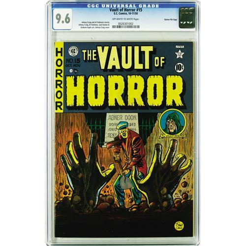 <B>Vault of Horror #15 Gaines File pedigree (EC, 1950) CGC NM+ 9.6 Off-white to white pages.</B></I> The Gaines File Copy displays astonishing color to go with its sharp corners and tight, flat spine. Frankly, it looks better than 9.6 -- still only one other copy of #15 has earned a higher grade from CGC to date. Featured is a Johnny Craig cover, with Craig, Al Feldstein, Jack Kamen, and Graham Ingels interior art. While CGC has certified this as a Gaines File Copy, no certificate accompanies the lot. Overstreet 2006 NM- 9.2 value = $1,150. CGC census 4/06: 4 in 9.6, 1 higher.