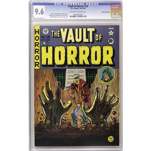 <B>Vault of Horror #15 Gaines File pedigree (EC, 1950) CGC NM+ 9.6 Off-white to white pages.</B></I> Johnny Craig drew this issue's cover as well as providing interior art. Joining him were Al Feldstein, Jack Kamen, and Graham Ingels. Note that while CGC has certified this book as a Gaines File Copy, no certificate accompanies this lot. Overstreet 2006 NM- 9.2 value = $1,150. CGC census 10/06: 4 in 9.6, 1 higher.<BR><BR><b>Shipping:</b> Slabbed Comic (<a target="_blank" href="http://www.heritageauctions.com/common/shipping.php">view shipping information</a>)