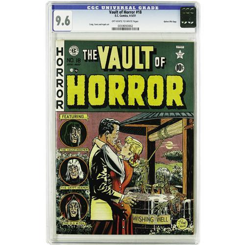 <B>Vault of Horror #18 Gaines File pedigree 5/12 (EC, 1951) CGC NM+ 9.6 Off-white to white pages.</B></I> Johnny Craig turns in a cover that would <I>almost</B></I> be at home on a romance comic -- but not quite! Looks like this Romeo might be getting more than he wished for! Craig, Jack Davis, Jack Kamen, and Graham Ingels furnish the interior art. Note that while CGC has certified this book as a Gaines File copy, the original certificate of authenticity no longer accompanies this book, although a photocopy has been included. Overstreet 2006 NM- 9.2 value = $700. CGC census 03/06: 1 in 9.6, 5 higher.