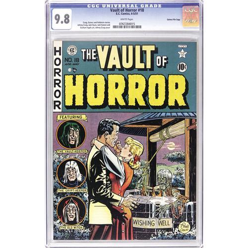 <B>Vault of Horror #18 Gaines File pedigree 7/12 (EC, 1951) CGC NM/MT 9.8 White pages.</B></I> This copy's essentially perfect, both in terms of grade and page quality! We've always liked this issue for Johnny Craig's cover, a "Wishing Well" so scary it would make Terence Trent D'Arby's dreadlocks stand on end! Contributing interior art to the issue were Craig, Jack Davis, Jack Kamen, and Graham Ingels. Overstreet 2006 NM- 9.2 value = $700. CGC census 5/06: 5 in 9.8, 1 higher. <BR><BR><B>Important notice:</B> Heritage usually auctions material at the rate of 200-250 lots per hour. On some occasions eBay Live bid software or the Internet may not be able to keep up with the pace of the auction. We recommend placing a realistic absentee bid now as insurance to avoid disappointment. Occasionally the auctioneer may eliminate or reject an eBay Live bid, and the auctioneer may also reopen a lot after the close of the eBay live bidding (usually because we missed an audience bid), and may reject your bid even if it shows you as the winning bidder. By bidding via eBay Live, you agree that Heritage may award the lot to another bidder at its sole discretion under the circumstances described above or any other reasonable circumstances. Since eBay bids are not shown to us until we open the lot on the floor, we treat those bids just like floor bids. In most cases the floor responds before the eBay bid is presented to us, due to Internet lag time, so for consistency we have made it a policy that floor bids are always considered first over tie eBay live bids. Also please note that all Heritage lots purchased through eBay Live carry a 22.5% Buyer's Premium. Please make sure you read the Terms and Conditions before you bid. This lot is being auctioned in conjunction with a live floor auction by Heritage Auction Galleries. All final auction and invoice information will be supplied by Heritage Auction Galleries, and all other information should be considered preliminary. Lot:41001 <BR><BR><B>Winning Notification and Billing:</B> After the FINAL session in this auction is complete, Heritage will send e-mail and snail mail invoices. This process normally takes several days. All final auction and invoice information will be supplied by Heritage Auction Galleries, and all other information should be considered preliminary. <BR><BR>This auction will be conducted on a live auction floor and over the Internet through eBay Live. If you choose to place an absentee bid, please take a moment to <font color='#0000ff'><u><a href='http://pages.ebay.com/liveauctions/help/before/laabsentee.html'>learn how eBay Live absentee bidding works</a></u></font><font color='#000000'>