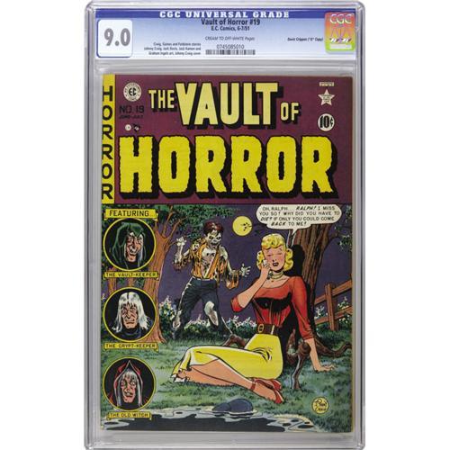 <B>Vault of Horror #19 Davis Crippen ("D" Copy) pedigree (EC, 1951) CGC VF/NM 9.0 Cream to off-white pages.</B></I> Johnny Craig's cover ties into the interior story "Reunion," which is illustrated by Graham Ingels. The issue also has interior art by Craig, Jack Davis, and Jack Kamen. Overstreet 2006 VF/NM 9.0 value = $525; NM- 9.2 value = $700. CGC census 9/06: 1 in 9.0, 9 higher. <I>From the Crippen Collection.</B></I><BR><BR><b>Shipping:</b> Slabbed Comic (<a target="_blank" href="http://www.heritageauctions.com/common/shipping.php">view shipping information</a>)