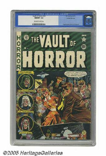 <B>Vault of Horror #20 Gaines File pedigree 1/12 (EC, 1951) CGC NM/MT 9.8 Off-white to white pages.</B></I> We've handled our share of Gaines File copies, including quite a few in the 9.8 echelon, but books like this still amaze us. The appearance is so outstanding - from the brightness and depth of the cover colors to the perfect spine structure and corner sharpness, and even to the sparkling clean white background of the back cover, that we know there can't be a nicer copy in existence. CGC's census bears that out. The Johnny Craig cover is backed up by story art from Craig, Jack Kamen, and Graham Ingels. Overstreet 2005 NM- 9.2 value = $535. CGC census 6/05: 4 in 9.8, none higher.