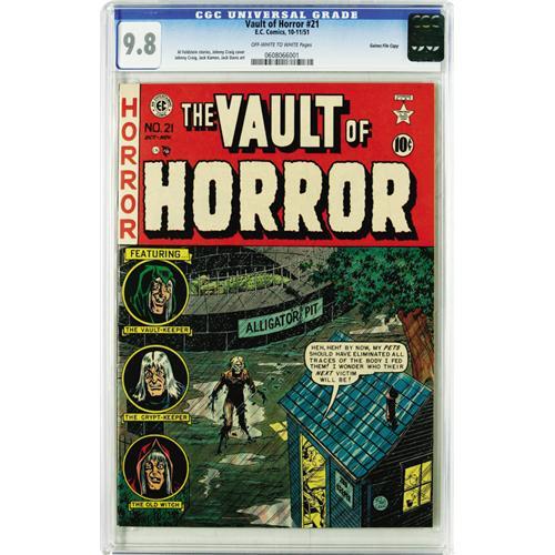 <B>Vault of Horror #21 Gaines File pedigree 2/12 (EC, 1951) CGC NM/MT 9.8 Off-white to white pages.</B></I> The good news is, despite Johnny Craig's "alligator pit" cover, nobody in the issue gets eaten by alligators. The bad news is, <I>lots</B></I> of guys get eaten by <I>crocodiles</B></I>, in the story "That's a Croc." That story was drawn by guest artist H. L. Larsen, while the other interior tales were in the hands of EC regulars Craig, Jack Kamen, and and Jack Davis. Overstreet 2006 NM- 9.2 value = $575. CGC census 3/06: 2 in 9.8, none higher.