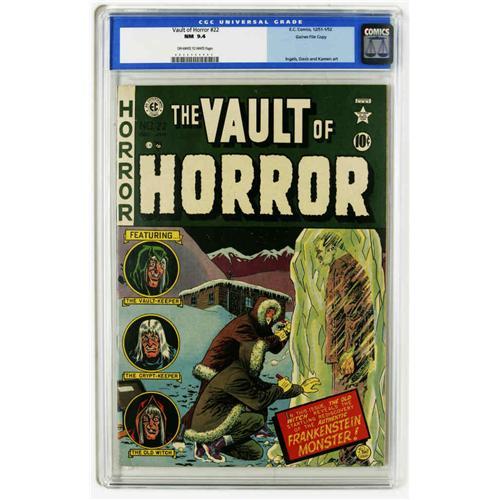 <B>Vault of Horror #22 Gaines File pedigree 1/12 (EC, 1951) CGC NM 9.4 Off-white to white pages.</B></I> Everyone's favorite patch-work man, the Frankenstein monster, appears on this cool cover by Johnny Craig, with Graham Ingels supplying the related story art. Other artists include Jack Davis and Jack Kamen. This exquisite File Copy features deep, rich cover colors and a crisp spine, with square corners. Overstreet 2005 NM- 9.2 value = $535. CGC census 12/05: 3 in 9.4, 3 higher.