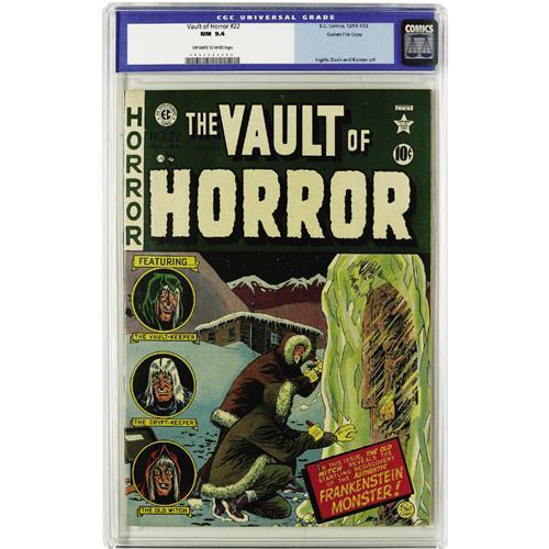 <B>Vault of Horror #22 Gaines File pedigree 1/12 (EC, 1951) CGC NM 9.4 Off-white to white pages.</B></I> Everyone's favorite patch-work man, the Frankenstein monster, appears on this cool cover by Johnny Craig, with Graham Ingels supplying the related story art. Other artists include Jack Davis and Jack Kamen. This exquisite copy features deep, rich cover colors and a crisp spine, with square corners. Overstreet 2006 NM- 9.2 value = $575. CGC census 03/06: 3 in 9.4, 3 higher.