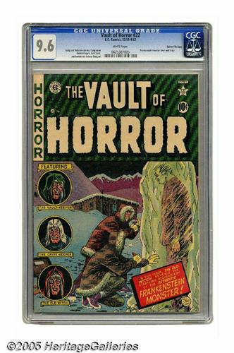<B>Vault of Horror #22 Gaines File pedigree 11/12 (EC, 1951) CGC NM+ 9.6 White pages.</B></I> This beautiful copy from the famed Gaines Files stash boasts the highest grade CGC has assigned to date for #22. A Frankenstein cover by Johnny Craig is supported by a Frankenstein-themed story with Graham Ingels providing the story art. Other interior art by Craig, Jack Davis, and Jack Kamen maintained EC's impeccable standards. Overstreet 2005 NM- 9.2 value = $535. CGC census 5/05: 2 in 9.6, none higher.