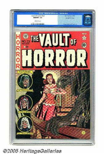 <B>Vault of Horror #23 Gaines File pedigree 9/12 (EC, 1952) CGC NM/MT 9.8 Off-white pages.</B></I> Jack Davis did double duty on this issue, and one of the two stories he drew was the soap-themed "99 44/100% Pure Horror." The issue also has art by Johnny Craig and Graham Ingels, plus a bio of the "Ghastly" one himself. The cover is by Craig. By the way, this book received that pre-Code badge of honor, a mention in <B>Parade of Pleasure</B></I>. Overstreet 2005 NM- 9.2 value = $535. CGC census 6/05: 4 in 9.8, none higher.