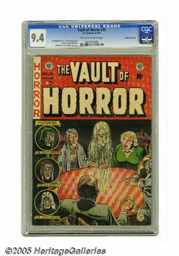 <B>Vault of Horror #25 Gaines File pedigree (EC, 1952) CGC NM 9.4 Off-white to white pages.</B></I> Two con men put on a fake seance... but is it really fake? That's the "hook" of the story drawn by Johnny Craig in this issue (the cover is also by Craig). And that's just a warm-up for the horror tale drawn by Graham Ingels in the same issue. It's called "Collection Completed," and we're not talking about a run of ECs, either. The issue also has stories drawn by Jack Davis and Jack Kamen. This is the highest-graded copy that CGC has certified for this issue to date. Note that while CGC has certified this book as a Gaines File copy, no certificate accompanies this lot. Overstreet 2005 NM- 9.2 value = $535. CGC census 1/05: 1 in 9.4, none higher