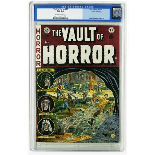 <B>Vault of Horror #27 Gaines File pedigree 1/12 (EC, 1952) CGC NM 9.4 Off-white to white pages.</B></I> "Beware of the Blob!" This issue's cover gets a jump on that popular 1958 feature film with a slimy, oozing creature all its own. Artists include Jack Davis, George Evans, and Graham Ingels. This sparkling pedigreed example is clean as a whistle, with great cover color and gloss. Overstreet 2005 NM- 9.2 value = $430. CGC census 12/05: 3 in 9.4, 3 higher.
