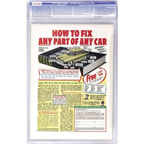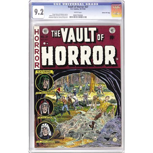 <B>Vault of Horror #27 Gaines File pedigree 8/12 (EC, 1952) CGC NM- 9.2 White pages.</B></I> The art of Johnny Craig graces this issue's cover, and inside the book there's the work of Craig, Jack Davis, George Evans, and Graham Ingels, the latter drawing the first in the series of "<I>Grim</B></I> Fairy Tales." Overstreet 2006 NM- 9.2 value = $465. CGC census 6/06: 1 in 9.2, 6 higher. <BR><BR><B>Important notice:</B> Heritage usually auctions material at the rate of 200-250 lots per hour. On some occasions eBay Live bid software or the Internet may not be able to keep up with the pace of the auction. We recommend placing a realistic absentee bid now as insurance to avoid disappointment. Occasionally the auctioneer may eliminate or reject an eBay Live bid, and the auctioneer may also reopen a lot after the close of the eBay live bidding (usually because we missed an audience bid), and may reject your bid even if it shows you as the winning bidder. By bidding via eBay Live, you agree that Heritage may award the lot to another bidder at its sole discretion under the circumstances described above or any other reasonable circumstances. Since eBay bids are not shown to us until we open the lot on the floor, we treat those bids just like floor bids. In most cases the floor responds before the eBay bid is presented to us, due to Internet lag time, so for consistency we have made it a policy that floor bids are always considered first over tie eBay live bids. Also please note that all Heritage lots purchased through eBay Live carry a 22.5% Buyer's Premium. Please make sure you read the Terms and Conditions before you bid. This lot is being auctioned in conjunction with a live floor auction by Heritage Auction Galleries. All final auction and invoice information will be supplied by Heritage Auction Galleries, and all other information should be considered preliminary. Lot:41001 <BR><BR><B>Winning Notification and Billing:</B> After the FINAL session in this auction is complete, Heritage will send e-mail and snail mail invoices. This process normally takes several days. All final auction and invoice information will be supplied by Heritage Auction Galleries, and all other information should be considered preliminary. <BR><BR>This auction will be conducted on a live auction floor and over the Internet through eBay Live. If you choose to place an absentee bid, please take a moment to <font color='#0000ff'><u><a href='http://pages.ebay.com/liveauctions/help/before/laabsentee.html'>learn how eBay Live absentee bidding works</a></u></font><font color='#000000'>
