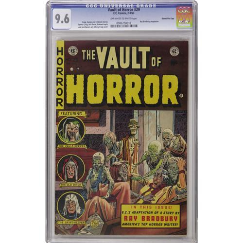 <B>Vault of Horror #29 Gaines File pedigree 8/11 (EC, 1953) CGC NM+ 9.6 Off-white to white pages.</B></I> A gruesome ghoul attack cover by Johnny Craig and interior art by Graham Ingels, Jack Kamen, Jack Davis, and Craig make this book a true treasure. Add to that structure and eye-appeal that are absolutely magnificent, and you have a real winner. Overstreet 2006 NM- 9.2 value = $465. CGC census 10/06: 5 in 9.6, none higher.<BR><BR><b>Shipping:</b> Slabbed Comic (<a target="_blank" href="http://www.heritageauctions.com/common/shipping.php">view shipping information</a>)