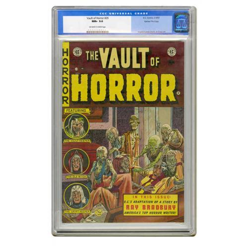 <B>Vault of Horror #29 Gaines File pedigree 8/11 (EC, 1953) CGC NM+ 9.6 Off-white to white pages.</B></I> This issue's gruesome "come join us" living-dead attack cover is by Johnny Craig -- you might want to lock your doors after this one! Interior art is furnished by Graham Ingels, Jack Kamen, Jack Davis, and Craig. A Ray Bradbury adaptation, "Let's Play Poison," is featured. Overstreet 2005 NM- 9.2 value = $430. CGC census 12/05: 4 in 9.6, none higher.