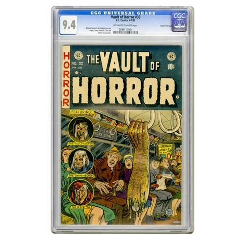 <B>Vault of Horror #30 Gaines File pedigree 11/12 (EC, 1953) CGC NM 9.4 Off-white to white pages.</B></I> Riding the New York subway system can be murder -- it'll cost you an arm and a leg for a good seat! Well, an arm at least, as the poor rider pictured on this issue's gruesome cover proves! In addition to the Johnny Craig "dismemberment" cover, there's interior art by Graham Ingels, George Evans, and Jack Davis. Overstreet 2005 NM- 9.2 value = $430. CGC census 12/05: 2 in 9.4, 1 higher.