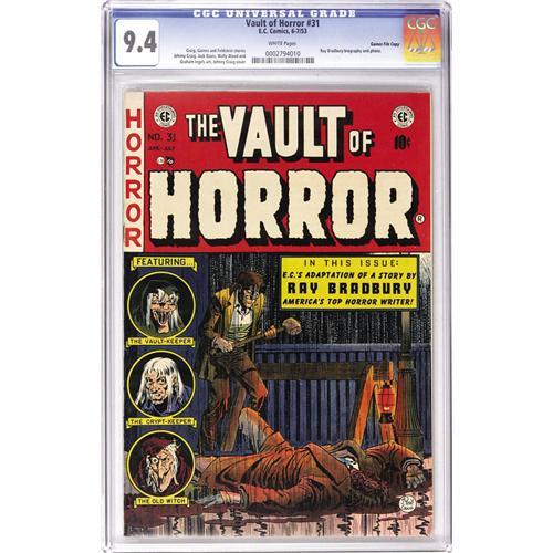 <B>Vault of Horror #31 Gaines File pedigree 6/12 (EC, 1953) CGC NM 9.4 White pages.</B></I> The most gruesome EC cover? This one by Johnny Craig would have to be considered for that designation. Also in the issue are an adaptation of Ray Bradbury's "The Lake," drawn by Joe Orlando, and the art of Craig, Jack Davis, and Graham Ingels. Overstreet 2006 NM- 9.2 value = $465. CGC census 6/06: 1 in 9.4, 3 higher. <BR><BR><B>Important notice:</B> Heritage usually auctions material at the rate of 200-250 lots per hour. On some occasions eBay Live bid software or the Internet may not be able to keep up with the pace of the auction. We recommend placing a realistic absentee bid now as insurance to avoid disappointment. Occasionally the auctioneer may eliminate or reject an eBay Live bid, and the auctioneer may also reopen a lot after the close of the eBay live bidding (usually because we missed an audience bid), and may reject your bid even if it shows you as the winning bidder. By bidding via eBay Live, you agree that Heritage may award the lot to another bidder at its sole discretion under the circumstances described above or any other reasonable circumstances. Since eBay bids are not shown to us until we open the lot on the floor, we treat those bids just like floor bids. In most cases the floor responds before the eBay bid is presented to us, due to Internet lag time, so for consistency we have made it a policy that floor bids are always considered first over tie eBay live bids. Also please note that all Heritage lots purchased through eBay Live carry a 22.5% Buyer's Premium. Please make sure you read the Terms and Conditions before you bid. This lot is being auctioned in conjunction with a live floor auction by Heritage Auction Galleries. All final auction and invoice information will be supplied by Heritage Auction Galleries, and all other information should be considered preliminary. Lot:41001 <BR><BR><B>Winning Notification and Billing:</B> After the FINAL session in this auction is complete, Heritage will send e-mail and snail mail invoices. This process normally takes several days. All final auction and invoice information will be supplied by Heritage Auction Galleries, and all other information should be considered preliminary. <BR><BR>This auction will be conducted on a live auction floor and over the Internet through eBay Live. If you choose to place an absentee bid, please take a moment to <font color='#0000ff'><u><a href='http://pages.ebay.com/liveauctions/help/before/laabsentee.html'>learn how eBay Live absentee bidding works</a></u></font><font color='#000000'>