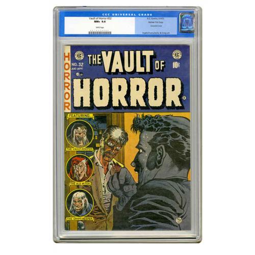 <B>Vault of Horror #32 Gaines File pedigree (EC, 1953) CGC NM+ 9.6 White pages.</B></I> There's definitely something "missing" on this issue's famous "censored" Johnny Craig cover, which illustrates the story "Out Of His Head." That something is, of course, a large meat cleaver, which was originally shown jutting out of the man in the doorway's now-shiny noggin. Other artists for this issue include Graham Ingels, George Evans (whose own "An Ample Sample" story was also "tampered with" before publication), and Jack Davis. Although recognized as a Gaines File Copy by CGC, this lot does not include a certificate. Overstreet 2005 NM- 9.2 value = $430. CGC census 12/05: 3 in 9.6, 1 higher.