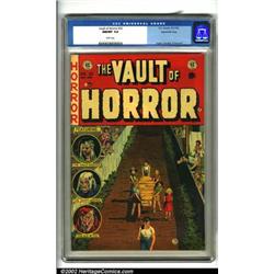 Vault of Horror #33 Gaines File pedigree 8/11 (EC, 1953). An exquisite copy in virtually flawless condition with bright, vivid color and stark white pages. The art and stories are exemplary as well, with Johnny Craig, Graham Ingels, Reed Crandall and Jack Davis all contributing to this issue. CGC NM/MT 9.8 White pages. Overstreet 2001 NM 9.4 value = $285. Important notice: We expect to be auctioning lots at the rate of 200-250 per hour. Sometimes eBay Premier live bid software cannot keep up with that pace, so we strongly recommend that you place a realistic proxy bid now as insurance to avoid disappointment. Also please note that all Heritage/CAA lots purchased through eBay Premier carry a 20% Buyer's Premium.