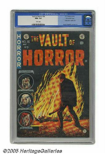 <B>Vault of Horror #36 Gaines File pedigree 1/12 (EC, 1954) CGC NM+ 9.6 White pages.</B></I> This issue is famous for its classic opium addict story, drawn by Bernie Krigstein. This <I>copy</B></I> is famous for the highest grade yet certified by CGC for #36. But there's more - there always <I>is</B></I> with EC issues and especially copies from the Gaines vaults. Johnny Craig's story "Twin Bill" was so good, it got itself cited in an article by Fredric Wertham. Artists Jack Davis and Graham Ingels also drew for this issue. Overstreet 2005 NM- 9.2 value = $430. CGC census 6/05: 5 in 9.6, none higher.