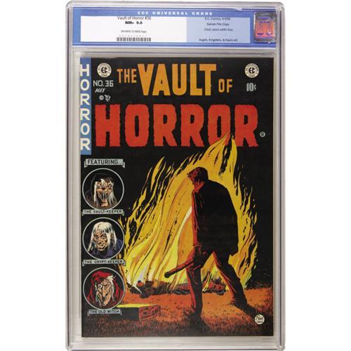 Overstreet lauds this issue for two stories. One is Johnny Craig's story "Twin Bill", which got cited in an article by Fredric Wertham. The other is a classic opium-addict story, "Pipe-Dream", drawn by Bernie Krigstein. Craig contributed the grisly cover art, and Jack Davis and Graham Ingels helped with the interior artwork. Overstreet 2006 NM- 9.2 value = $465. CGC census 12/06: 6 in 9.6, none higher.<BR><BR><b>Shipping:</b> Slabbed Comic (<a target="_blank" href="http://www.heritageauctions.com/common/shipping.php">view shipping information</a>)
