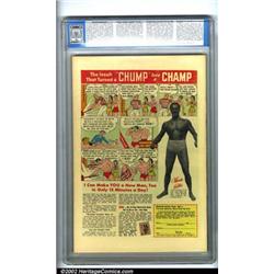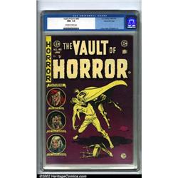 Vault of Horror #40 Gaines File pedigree 9/12 (EC, 1954). In an innovative cover by Johnny Craig, the pale yellow figures are spotlighted against a contrasting purple zipatone-enhanced field, creating a high-impact work of pop art. This is the last issue of this title and the distribution was limited, and the vampire cover and story lend to its cross-collecting value. The condition and eye-appeal are fantastic. All together, it adds up to one very desirable comic book. CGC NM+ 9.6 Off-white to white pages. Overstreet 2001 NM 9.4 value = $310. Important notice: We expect to be auctioning lots at the rate of 200-250 per hour. Sometimes eBay Premier live bid software cannot keep up with that pace, so we strongly recommend that you place a realistic proxy bid now as insurance to avoid disappointment. Also please note that all Heritage/CAA lots purchased through eBay Premier carry a 20% Buyer's Premium.