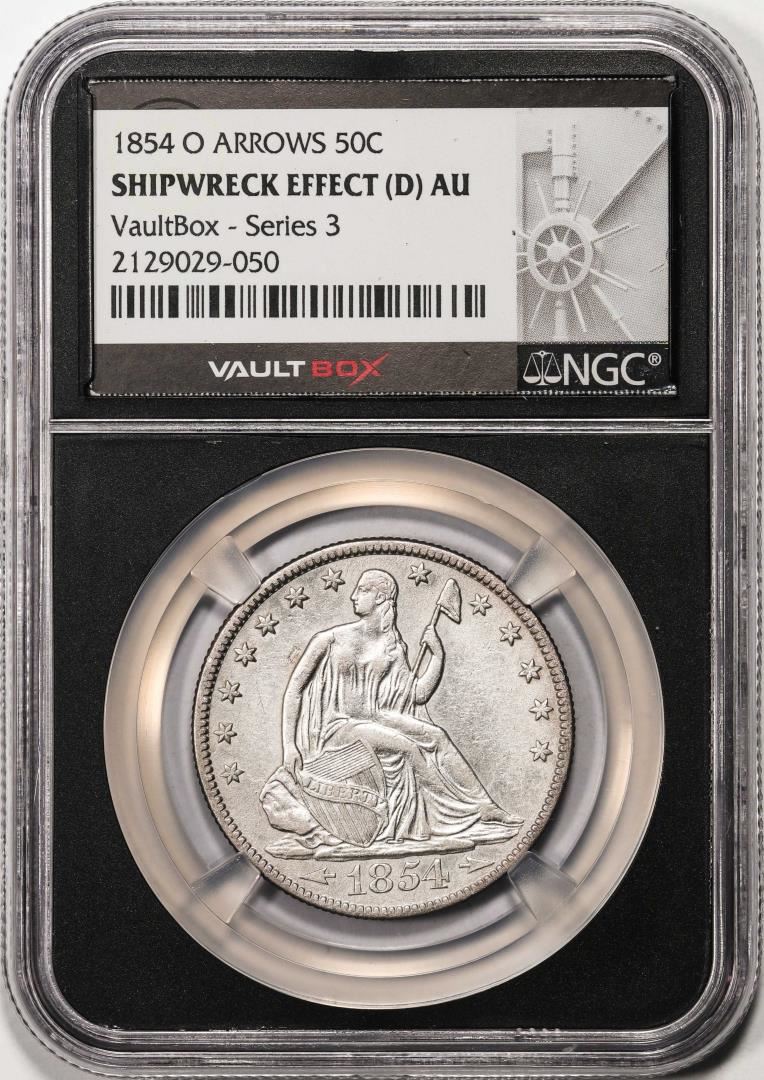 One Vaultbox SS Republic 1854-O w/Arr Seated Liberty Half Dollar Coin NGC Shipwreck Effect. NGC Certified.