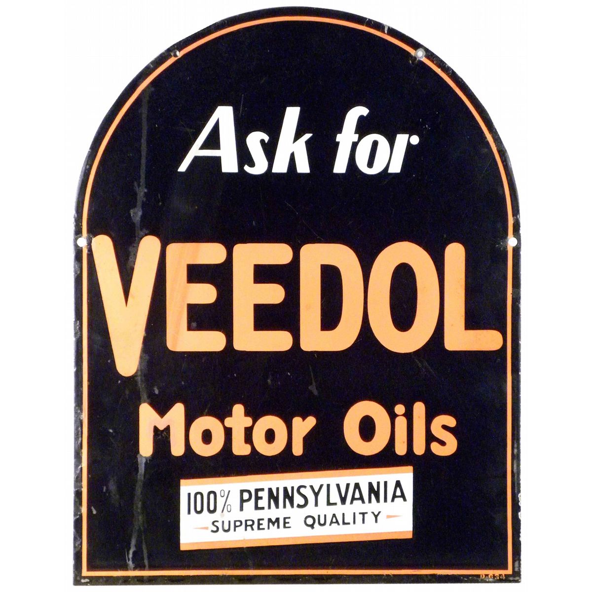 Veedol Motor Oils Porcelain Sign. Minor chips throughout, one side poor condition. 22 X 28 inches.