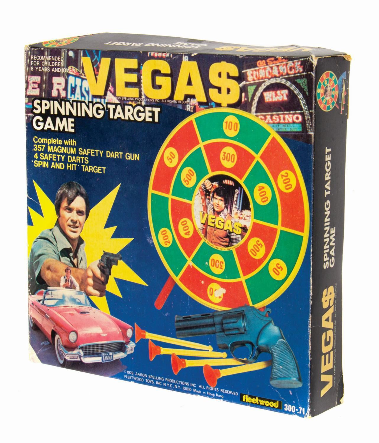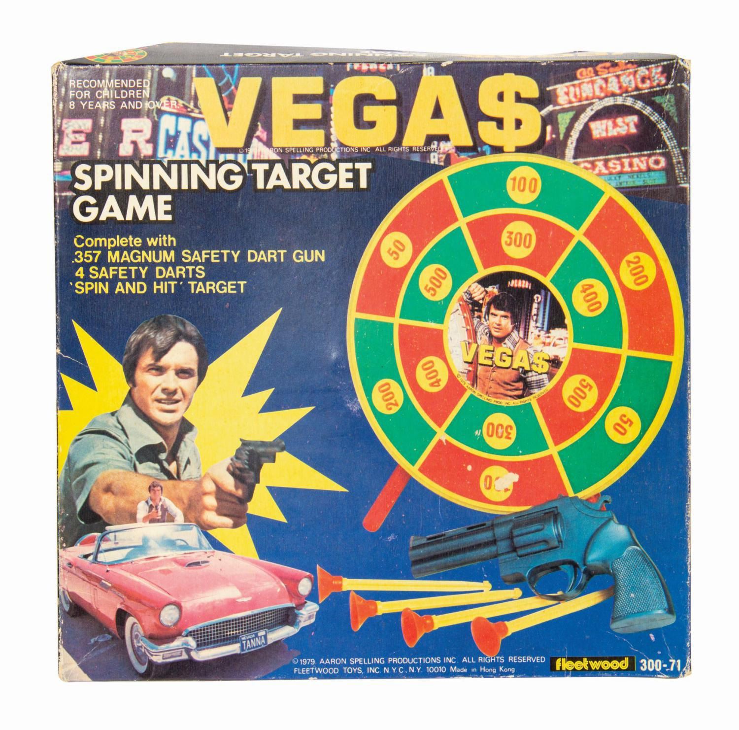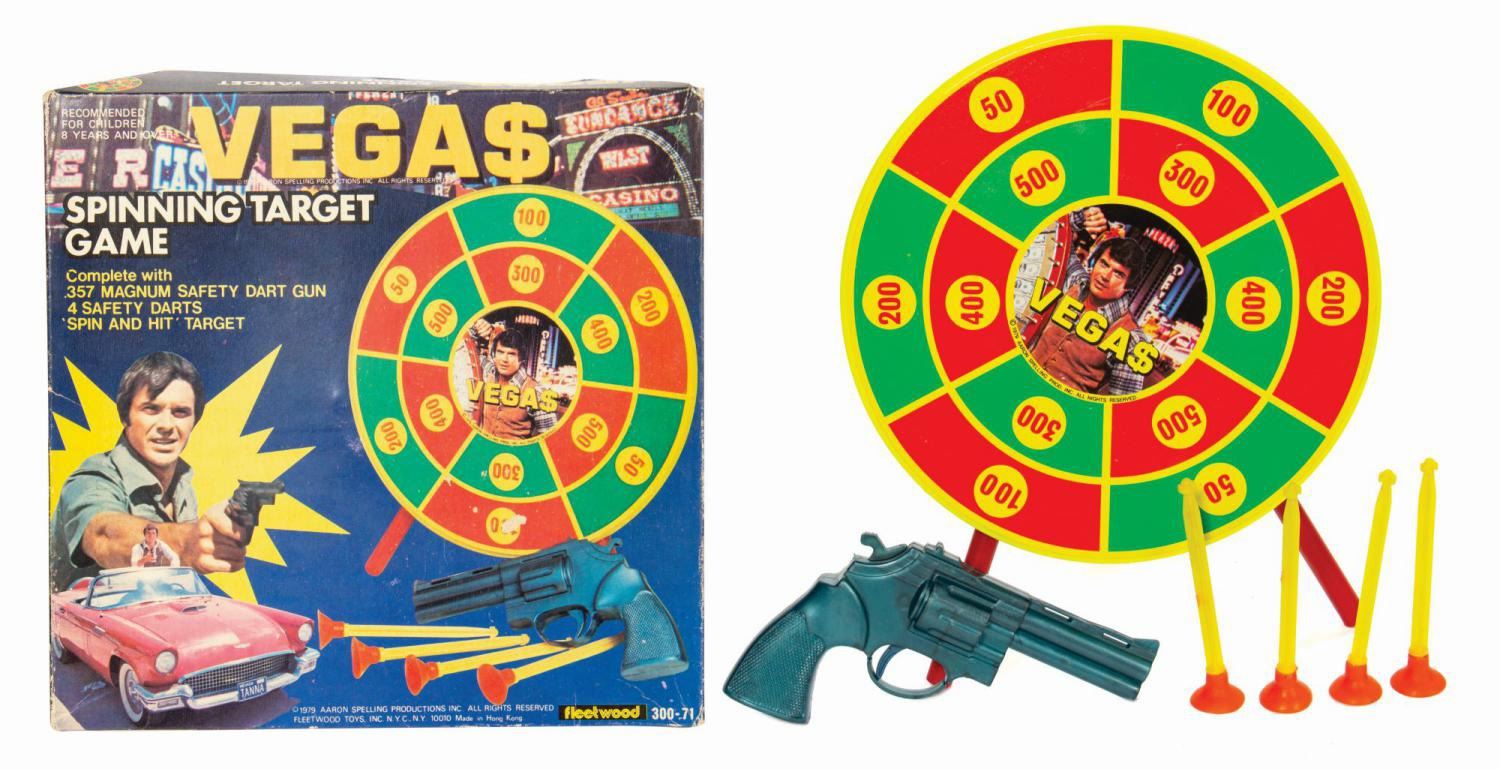 (Fleetwood, 1979) A vintage Vega$ Spinning Target Game playset manufactured by Fleetwood Toys. The set consists of a bullseye-style target with three removable legs, a spring loaded plastic dart gun modeled on a .357 Magnum, and four suction cup darts. All items are assembled in the original cardboard box packaging. Measuring 10"x10" and 1.75" in deep, the box is in good condition. It exhibits some minor fading, edge wear, spot surface loss, creases, a tiny tear, and tape residue. The playset exhibits some age and handling, with minor wear to the dart shafts.