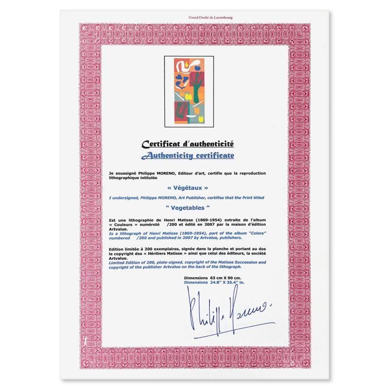 "Vegetaux" is a limited edition lithograph by Henri Matisse (1869-1954) bearing the plate signature of the artist. This piece comes from an edition of 200 authorized by the Matisse Estate; the edition number is not on the piece itself but on the certificate. This piece comes custom framed. Includes Certificate of Authenticity. Measures approx. 31" x 41.5" (frame), 25" x 35.5" (image).