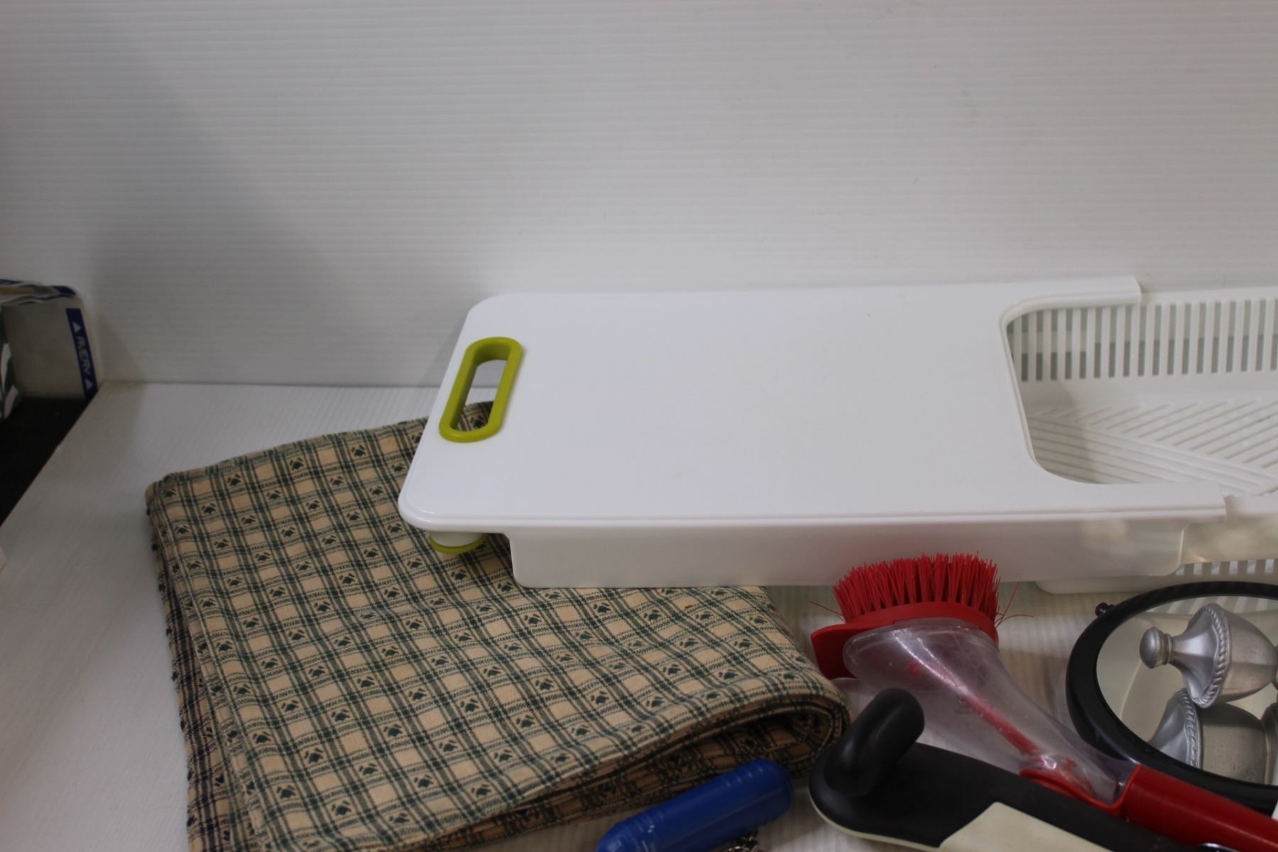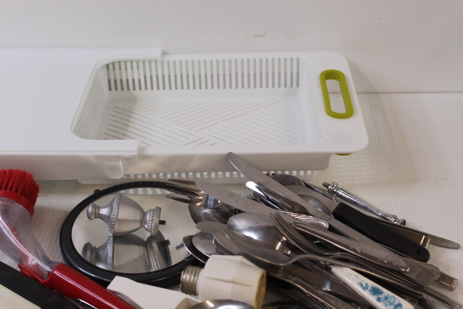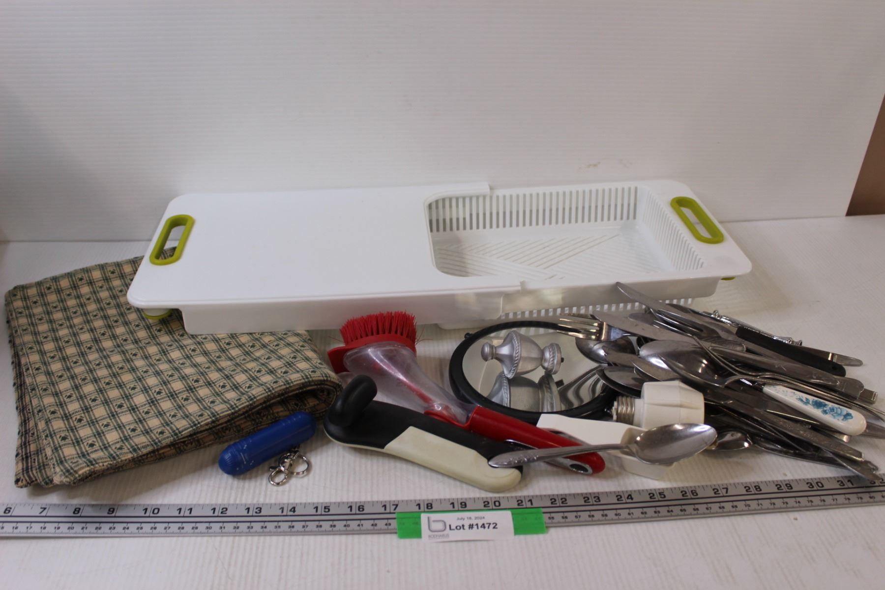 Veggie Washing Tray & Cutting Board, Cloth Tablecloth, Various Silverware Items