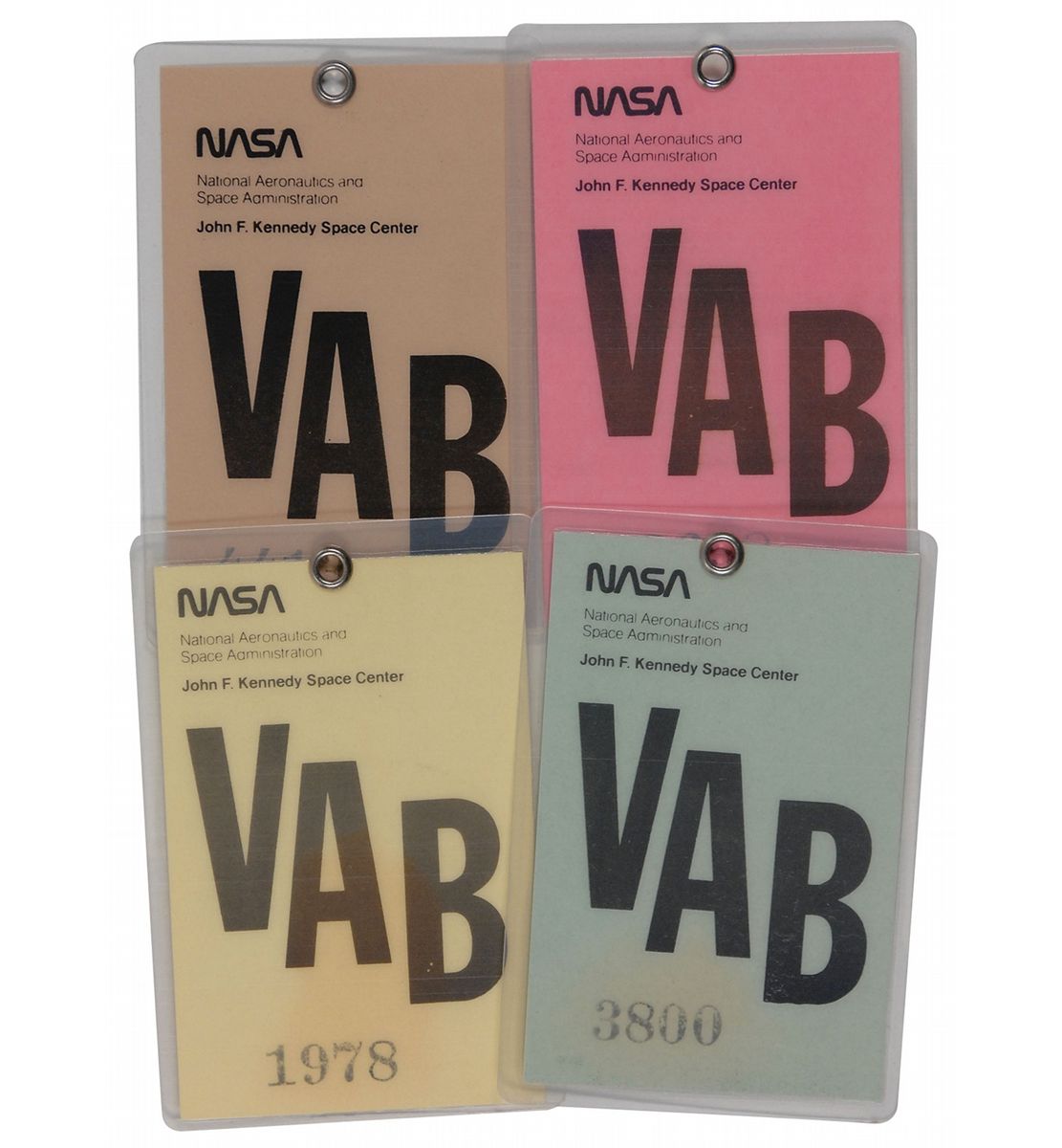 Collection of four different color laminated NASA Vehicle Assembly Building badges from the 1970s. Each measures 2.5 x 4 with a hole at the top of each for a lanyard. In fine condition.