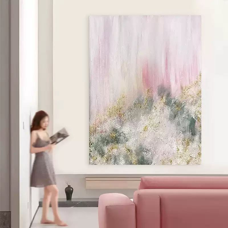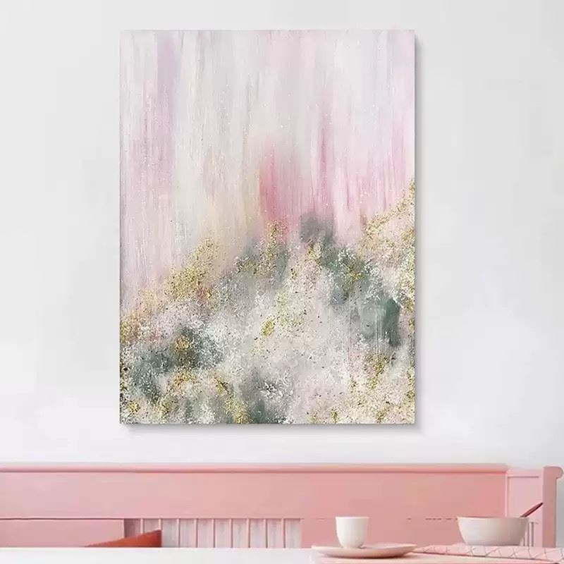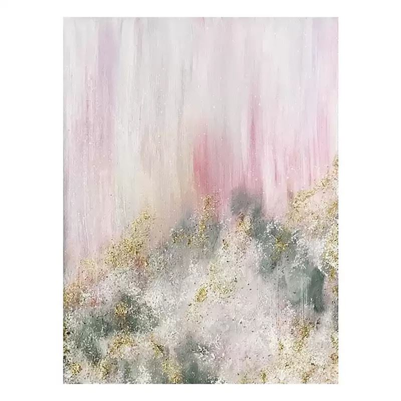 Soft pink haze cascades from the top of the canvas like a sky tinted by gentle dusk. Below, golden and grey-green textures rise and fall like distant peaks, forming a mist-shrouded golden mountain that glimmers faintly through the fog—quiet, yet far from lifeless. Dimensions: 24 x 31 inches.