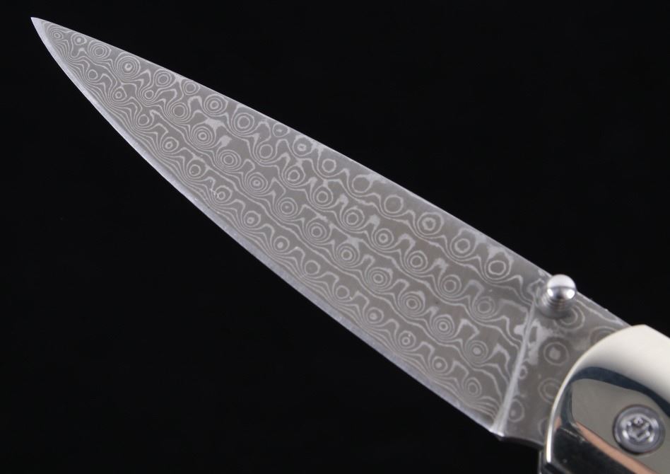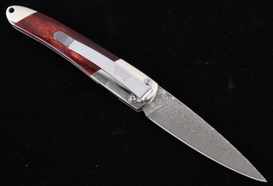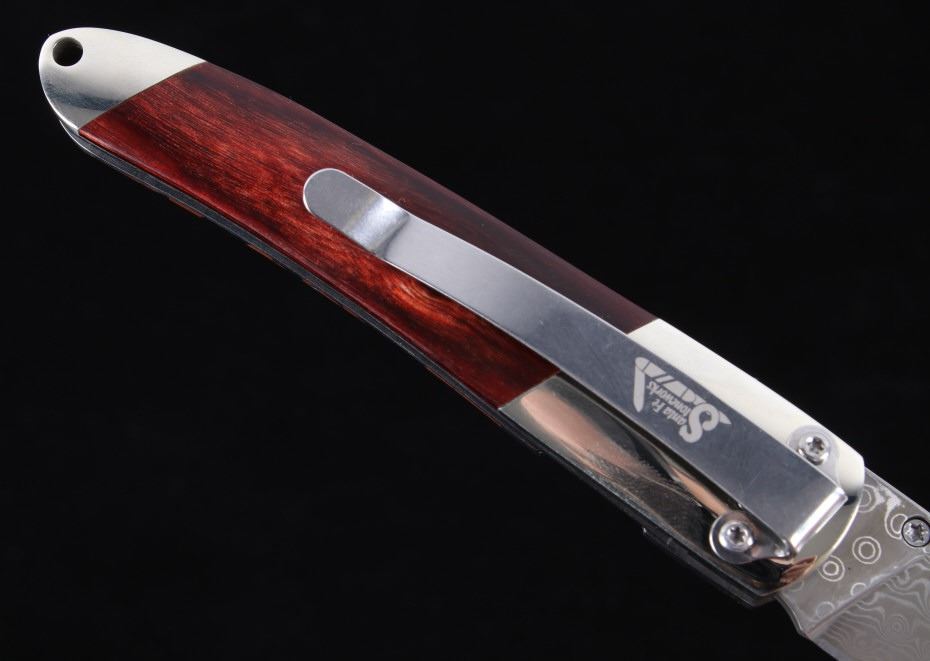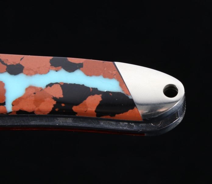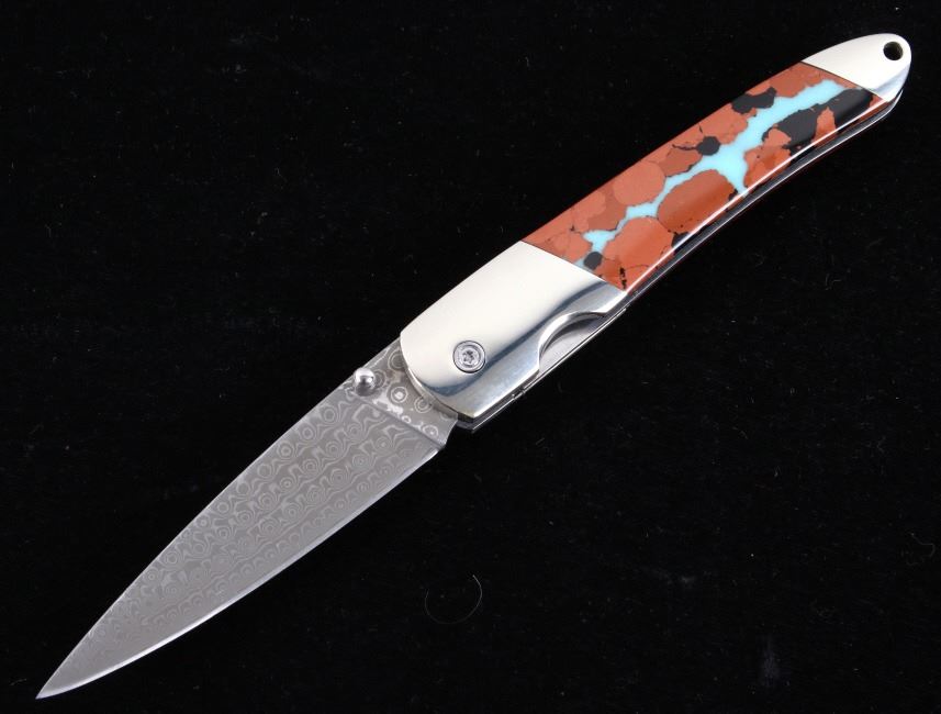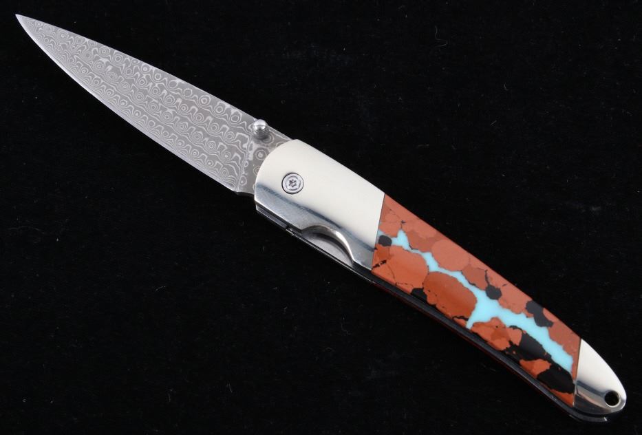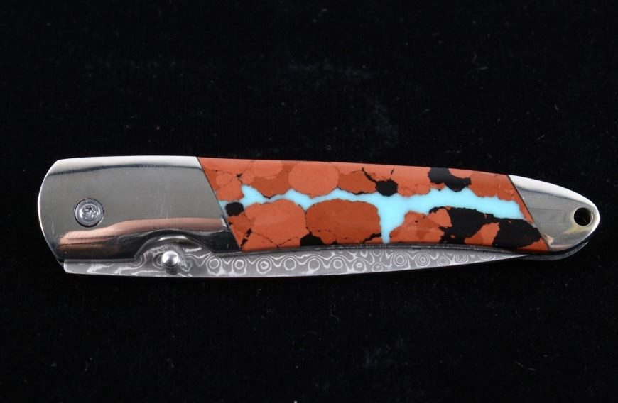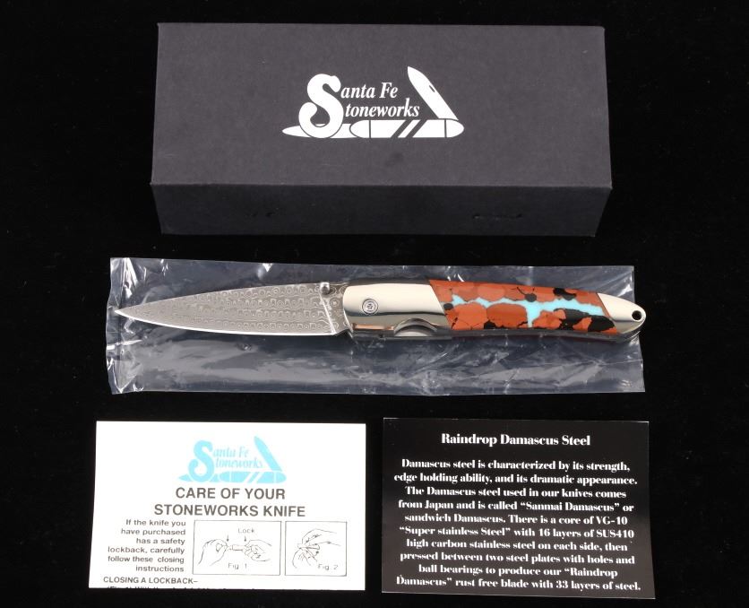 This is an original handmade custom knife showing a folded forged raindrop Damascus blade with premium Nacozari Turquoise grips. The knife is from Santa Fe Stone-works. The grip shows a exceptional rare Nacozari Mine Vein Turquoise grips. These vein turquoise stones are from the Nacozari Mine in Sonora, Mexico just south of Bisbee, Arizona. The blade shows a "Sanmai Damascus" which has a core of VG-10 "super stainless steel" with 16 layers of SUS410 high carbon stainless steel on each side making an over 33 layer work of art. The knife also shows a set of polished silver nickel bolsters. This is a liner lock knife showing a 4" long body with a 3 1/4" long blade with belt pocket clip. The knife comes with the original Santa Fe Stoneworks box and original paper work. This is a brand new knife.