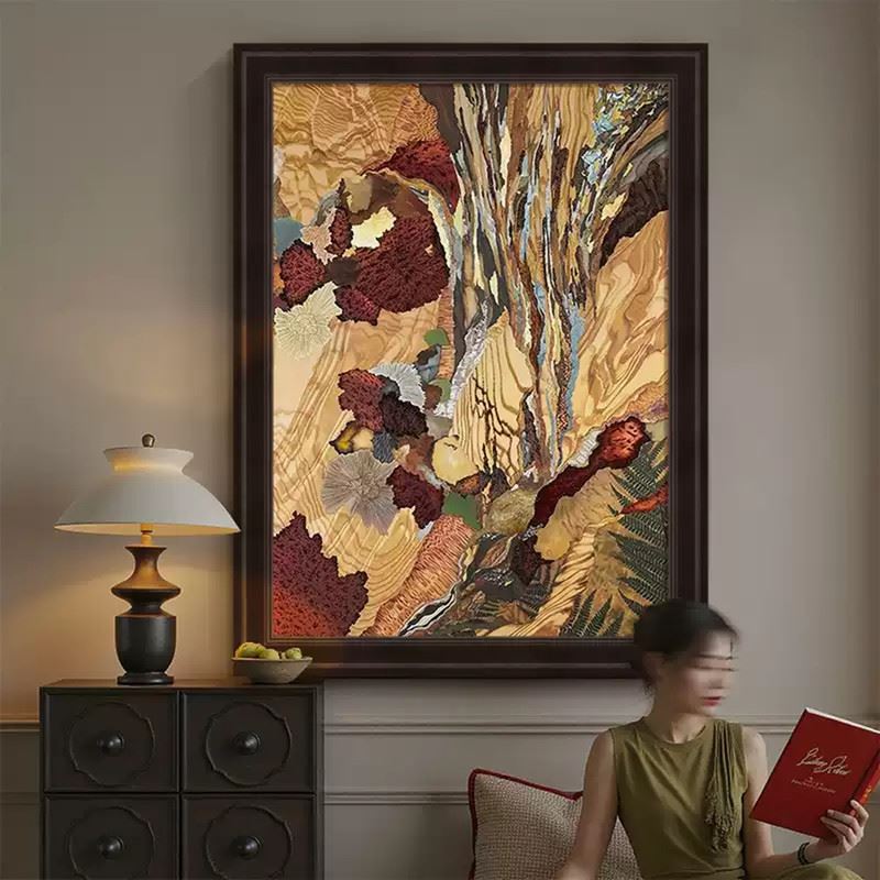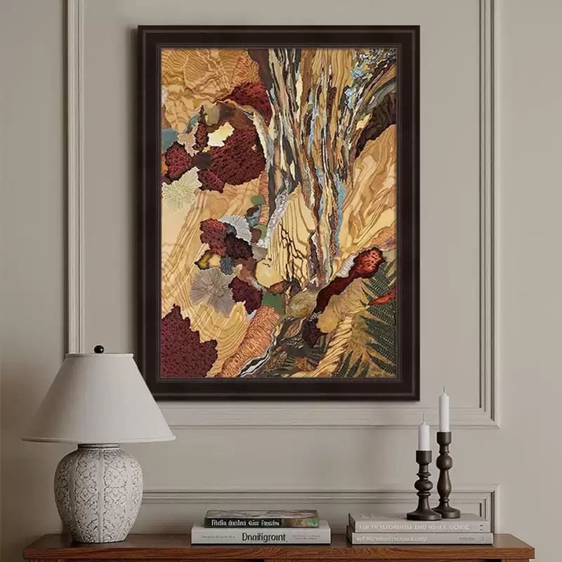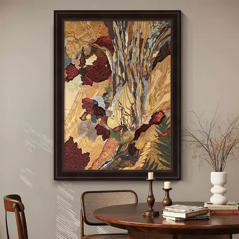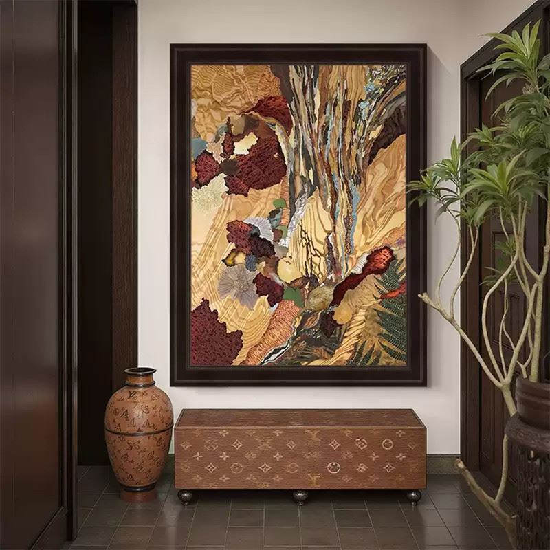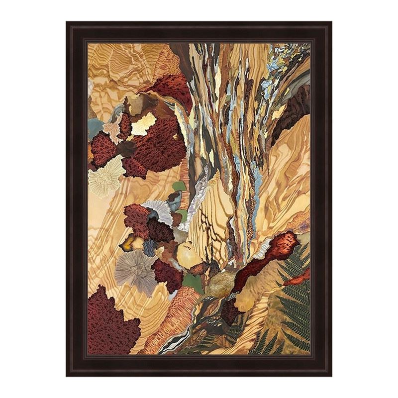 This artwork uses rich colors and textures to showcase the power and beauty of the earth. The abstract tree trunk and layers of rocks intertwine, presenting the vitality and dynamism of nature. Dimensions: 24 x 31 inches.