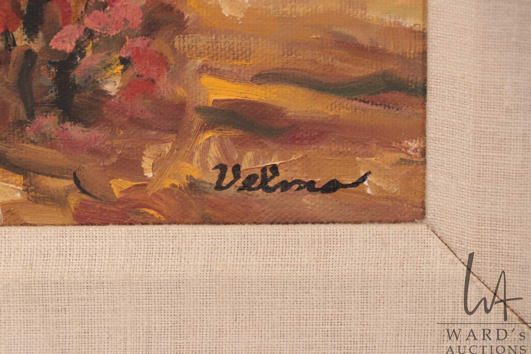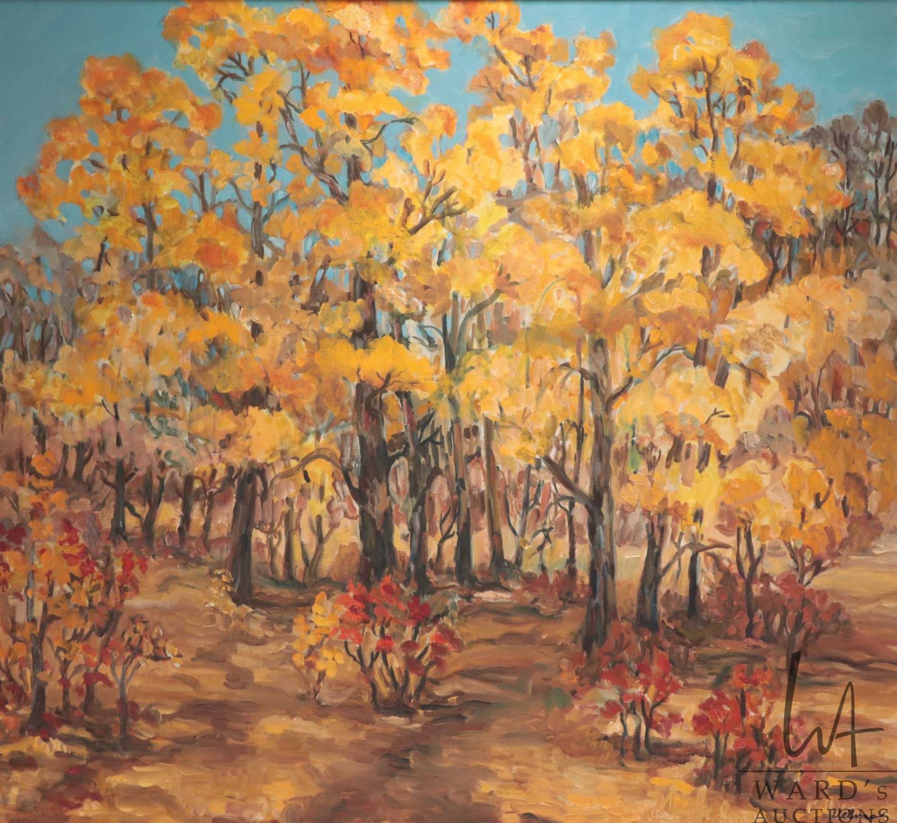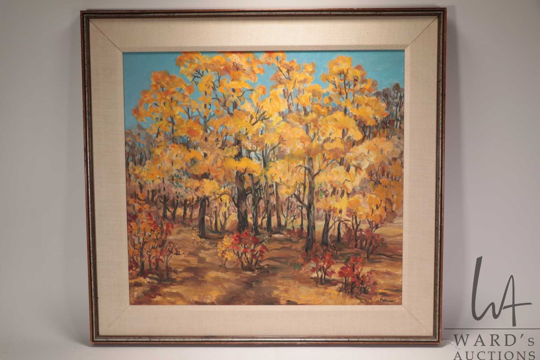 Velma Heath, framed acrylic on canvas, titled on verso "Poplars & Sunshine" 23" X 25 1/2". Note: Not available for shipping. Local pickup only