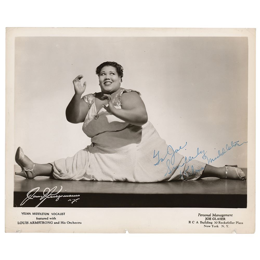 Vintage glossy 10 x 8 photo of Middleton doing an impressive split, signed and inscribed in fountain pen, "To Joe, Sincerely, Velma Middleton." In fine condition, with three binder dings to the bottom edge.